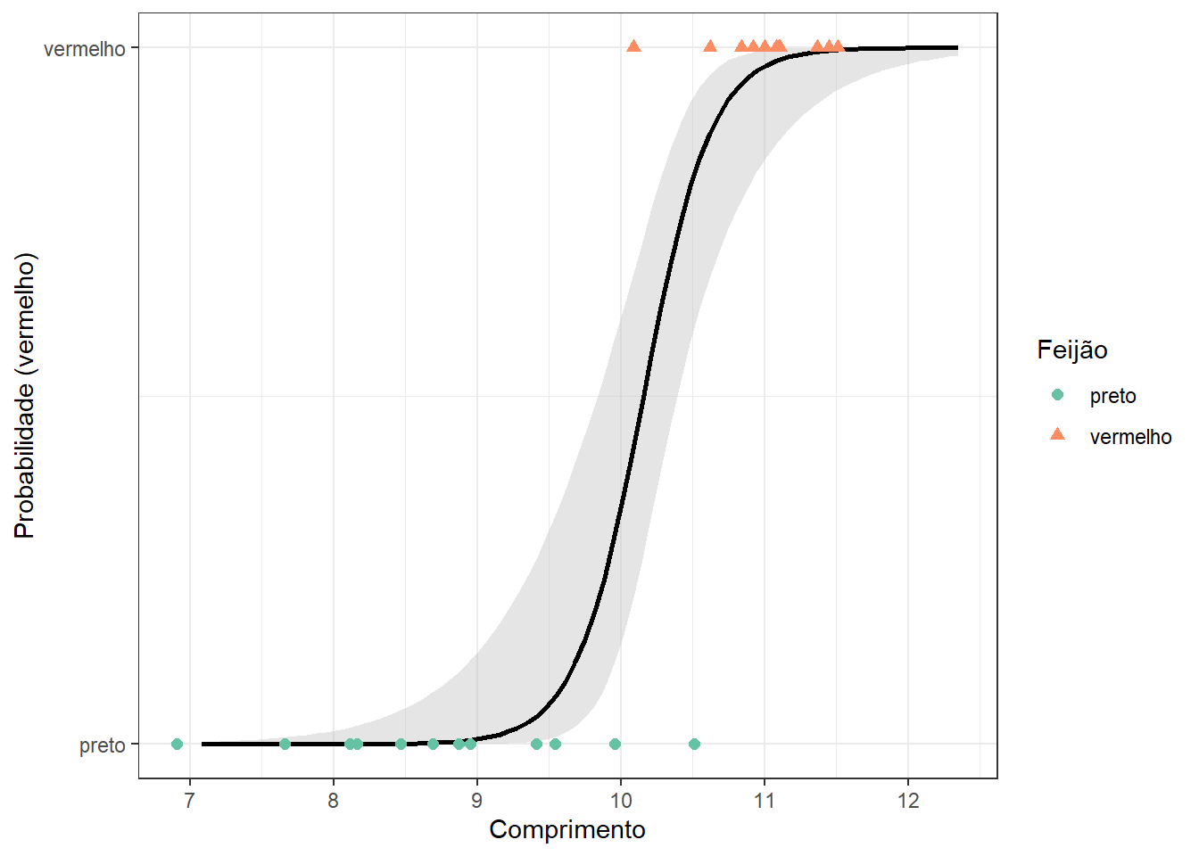 tidy(reglog1)O gráfico abaixo plota a probabilidade do feijão ser vermelho em função do comprimento.