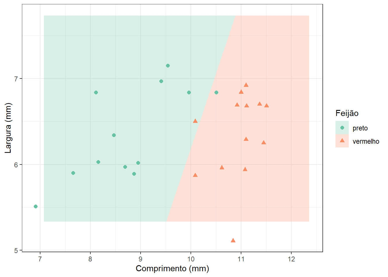 Neste segundo exemplo da Figura 1.8 considera-se além do comprimento a largura do feijão para obter um modelo de regressão logística para prever a probabilidade de o feijão ser vermelho entre vermelhos e pretos. No gráfico é plotada a fronteira de classificação, isto é, \(p(y=1) = 0,5\). Foram consideradas 75 observações para treinamento e 17 para teste do modelo.