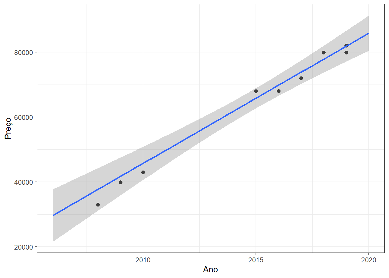set_engine("lm")Em seguida, realiza-se a modelagem. Inicialmente chama-se o método anteriormente definido, sendo o supervisor e o preditor dados no comando fit, sempre no argumento formula com y ~ x, isto é, resposta em função da variável independente. Deve-se, também, definir no argumento data os dados usados para treinar o modelo. Outra possibilidade seria usar os comandos nativos da linguagem R para obter o mesmo modelo, lm(Preco ~ Ano, data = dados_treino) e, em seguida, usar summary() para ver o modelo e os resultados do teste t para os coeficientes de regressão. Entretanto, sugere-se ao leitor o uso da abordagem tidymodels a qual viabilizará, um fluxo de trabalho padronizado com saída mais profissional, especialmente em casos onde deseja-se comparar modelos e otimizar hiperparâmetros.