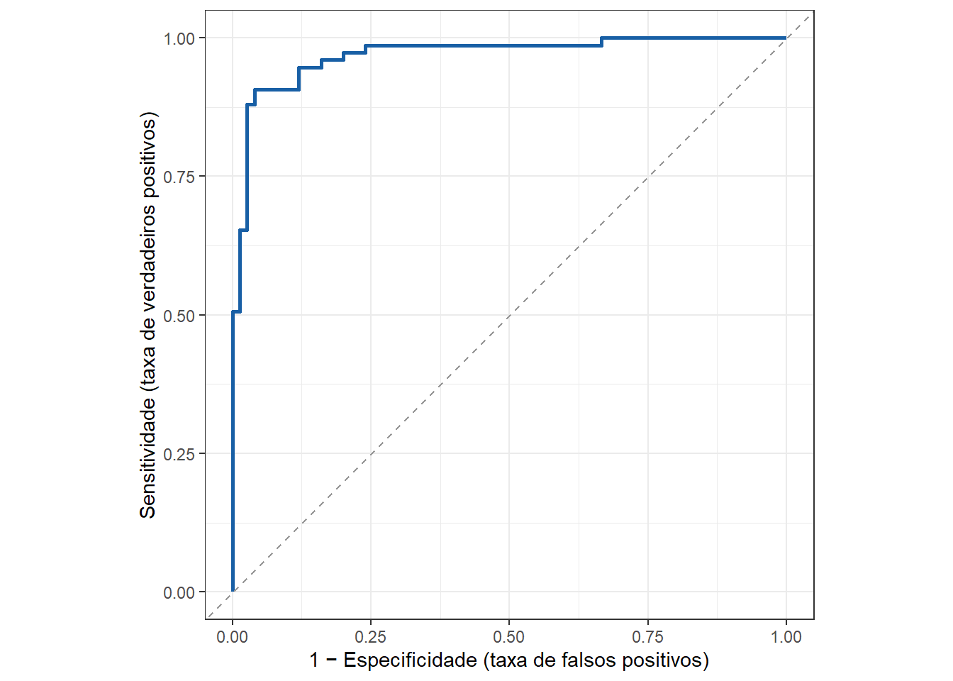 A curva característica de operação do receptor (Receiver Operating Characteristic - ROC) é comumente utilizada para avaliar o desempenho de modelos de classificação binária, plotando a sensitividade - ou taxa de verdadeiros positivos em relação ao complementar da especificidade, isto é, a taxa de falsos positivos. A curva mede a capacidade do modelo distinguir entre as classes positivo e negativo. É eficaz para conjuntos de dados desequilibrados, focando na distinção entre as classes e não apenas na acuracidade. Quanto maior a área abaixo da curva ROC (area under curve - AUC), \(AUC \in [0,1]\), melhor o modelo. A Figura 12.1 plota uma curva ROC arbitrária. Caso a curva esteja próxima da linha diagonal, o modelo não apresenta maior capacidade de distinção que o acaso.