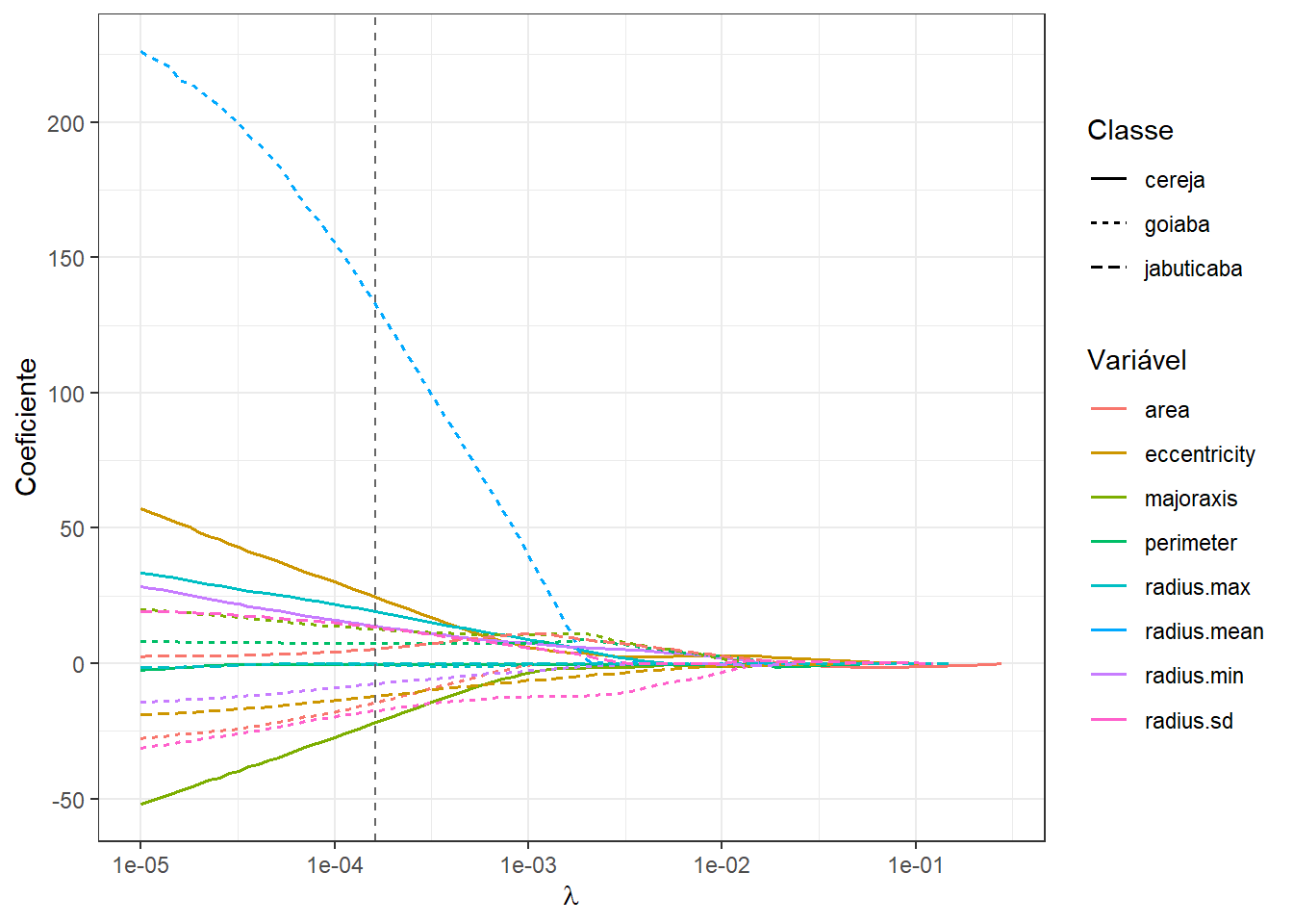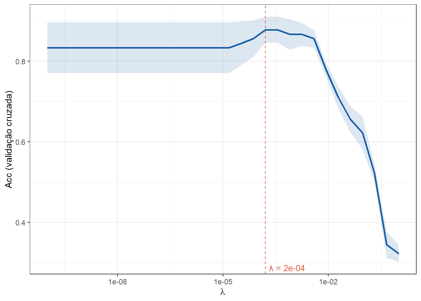 dados_teste3 <- testing(dados_split3)É importante salientar que o comando logistic_reg só serve para regressão logística binária, sendo o comando multinom_reg usado para o caso multinomial. O comando tune_grid realiza otimização de hiperparâmetros, neste caso da penalização de encolhimento via LASSO, \(\lambda\). Para tal, ele necessita de um grid de candidatos, obtido neste exemplo com o comando grid_regular. Ademais, é necessário o particionamento dos dados para realizar a validação por \(k\)-dobras, obtido via vfold_cv e especiicada em resamples. Ao final da busca, deve-se separar o \(\lambda\) ótimo via select_best. Em sequência, deve-se finalizar o workflow via finalize_workflow e estimar o modelo via fit com a penalização ótima e os dados de treino.
