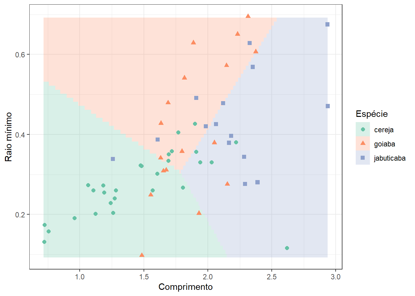 labs(x = "Comprimento", y = "Raio mínimo", col = "Espécie", fill = "Espécie", pch = "Espécie") +