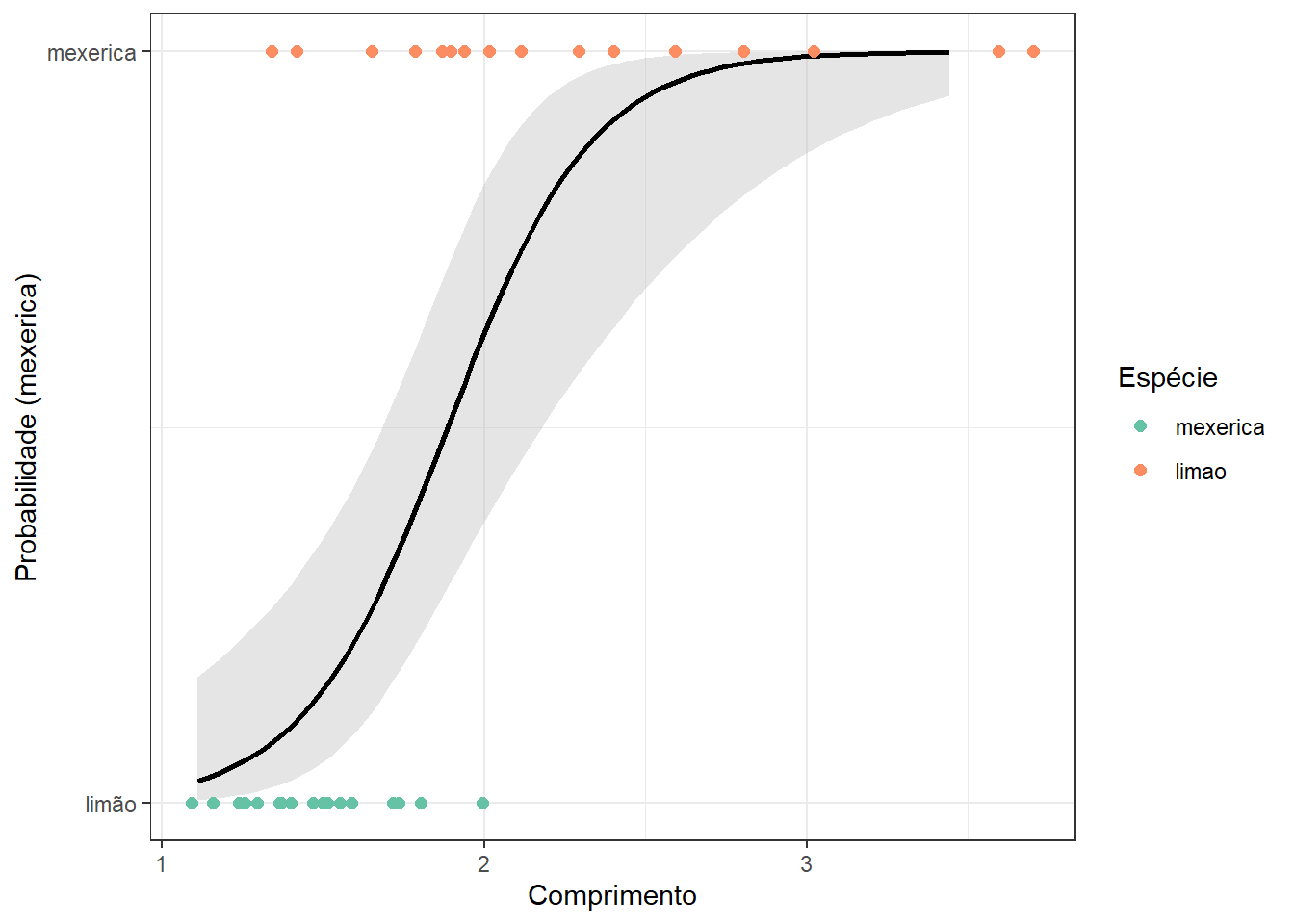 O modelo obtido no exemplo pode ser escrito conforme Equação 13.8. Tal modelo é útil para prever a probabilidade de a árvore ser de mexerica em função do comprimento da folha.