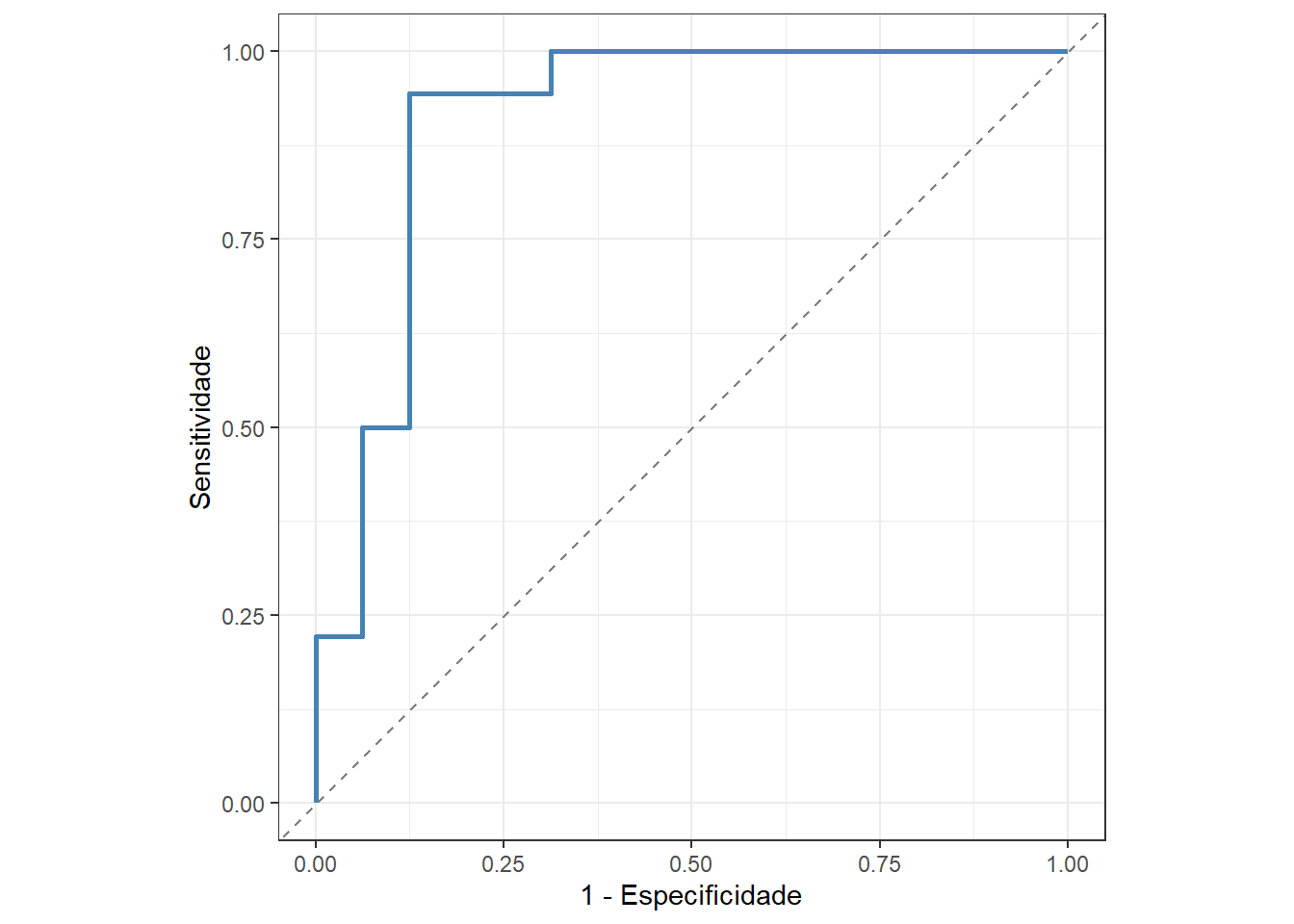 A Figura 13.7 apresenta a curva ROC para o exemplo, com AUC = 0,91, apresentado boa capacidade de previsão.