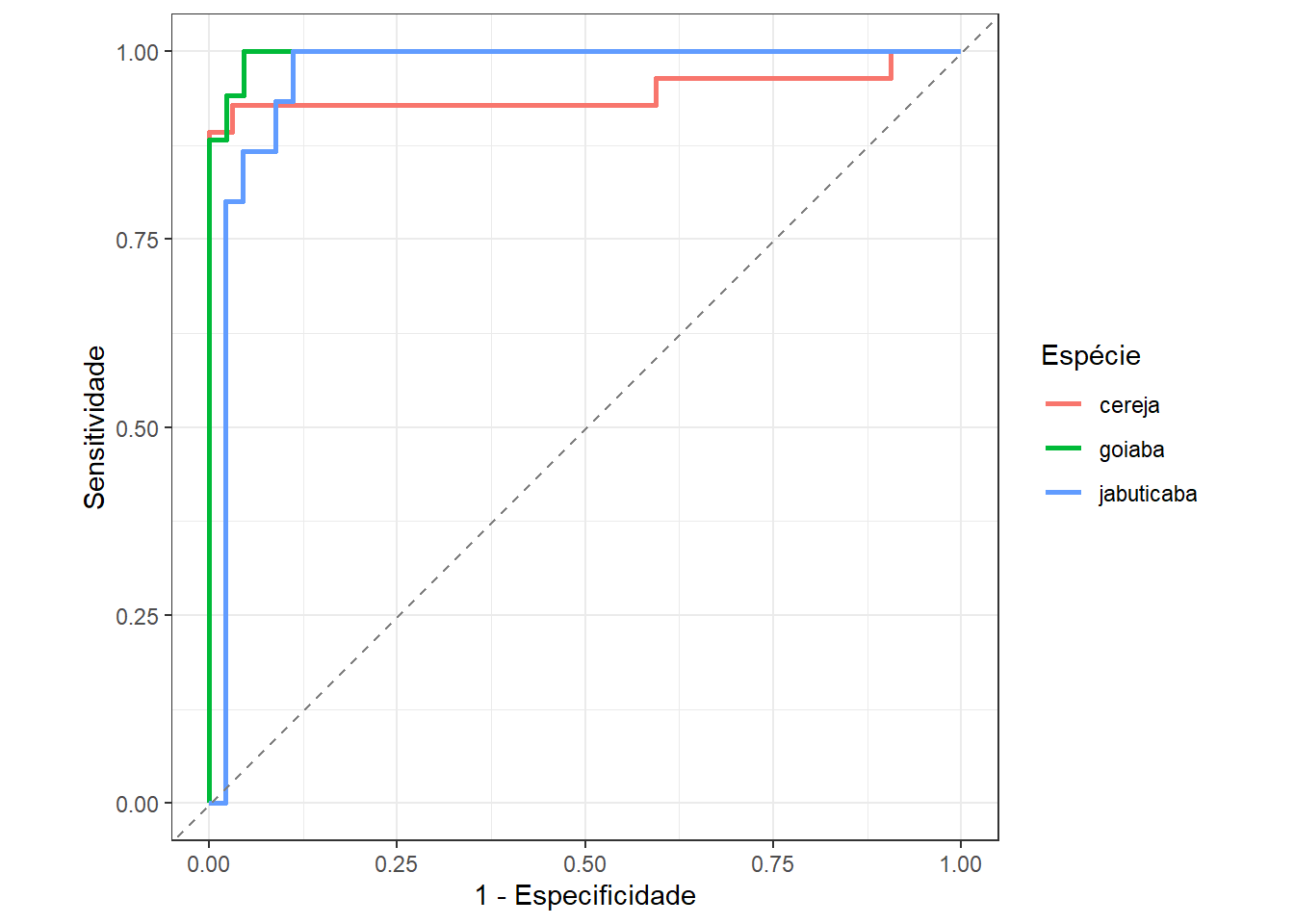 A Figura 13.8 resume as métricas de ajuste para o modelo que considera o comprimento e o raio mínimo. Observa-se que o modelo apresenta maior sensitividade que especificidade, isto é, acerta mais ao prever a classe positiva (mexerica) que a negativa (limão).