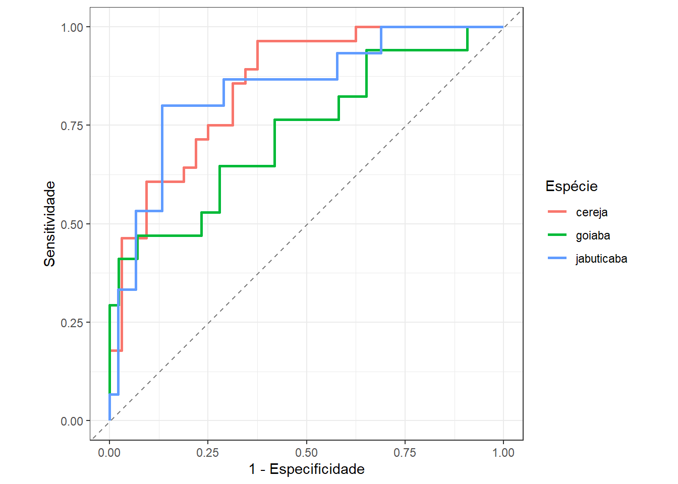 .pred_mexerica)O comando roc_curve viabiliza a obtenção dos dados para obter a curva ROC, sendo esta plotada com o comando autoplot.