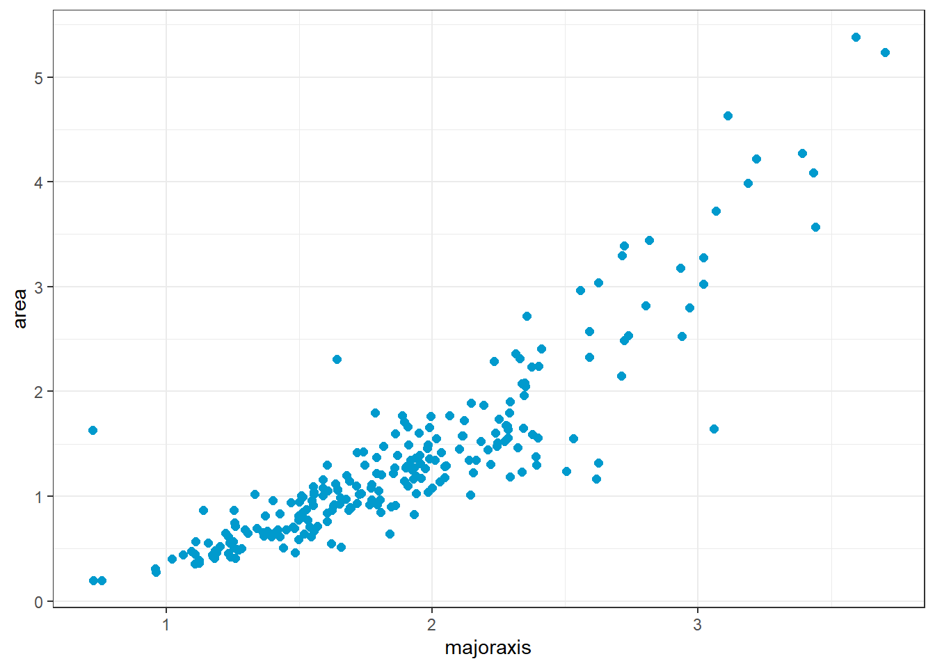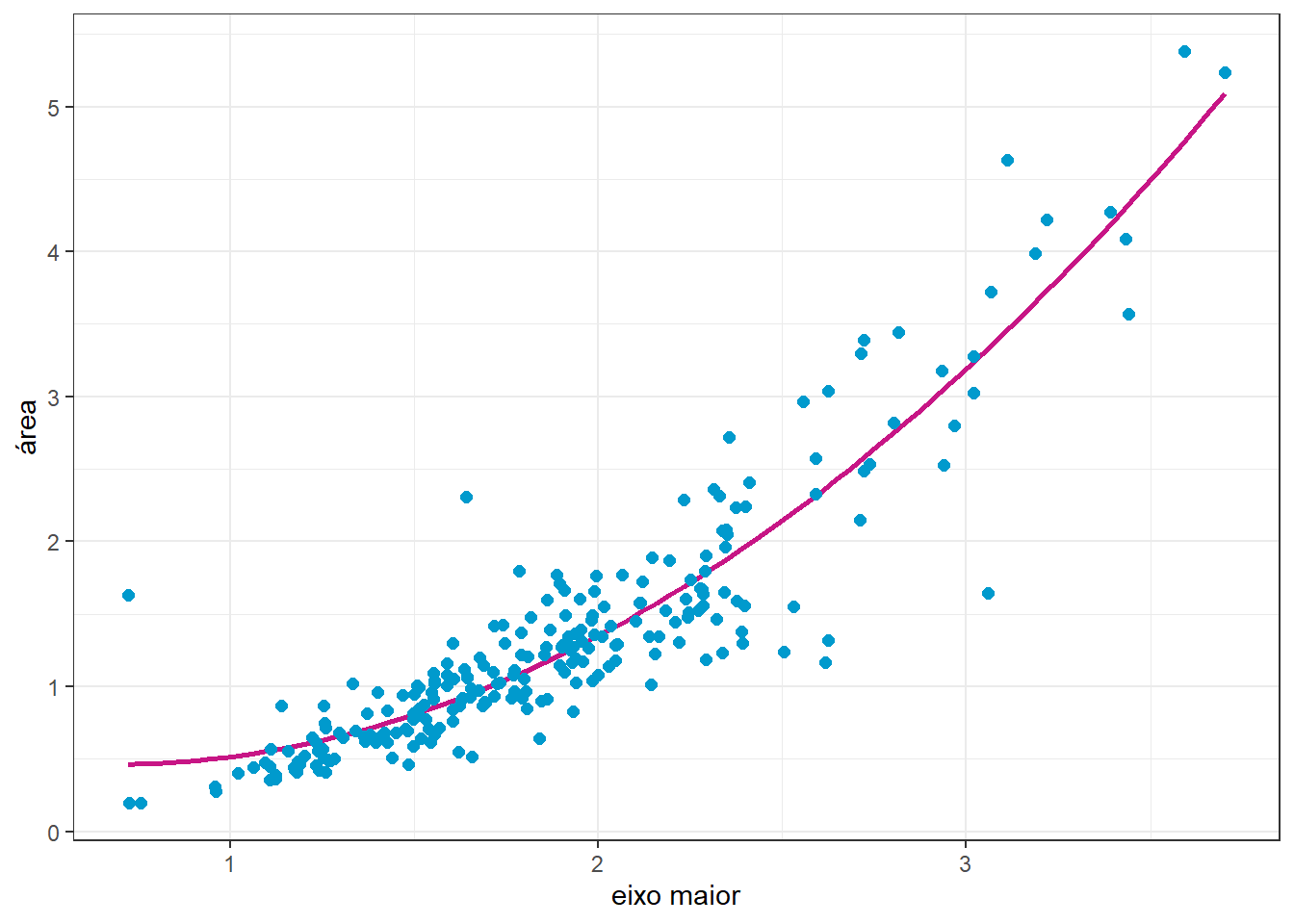folhas_teste <- testing(folhas_split)Inicialmente, realiza-se a aproximação de um modelo de regressão linear simples para prever a área das folhas em função da dimensão do eixo maior (majoraxis).