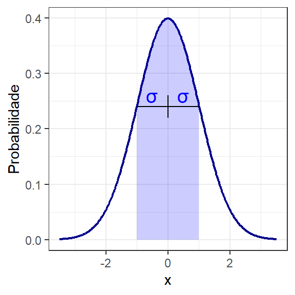 Os parâmetos populacionais da distribuição normal podem ser calculados conforme a Equação 1.2 e a Equação 1.3. A variância populacional \(\sigma^2\) tem unidade de medida igual ao quadrado da unidade de medida da va em avaliação. Neste sentido, uma outra medida é comumente utilizada como medida de dispersão, o desvio-padrão, \(\sigma\), sendo calculado conforme a Equação 1.4. O desvio-padrão, \(\sigma\), tem sua unidade de medida igual à da va de interesse, sendo de interpretação mais fácil como medida de dispersão em situações práticas. Uma propriedade importante do desvio-padrão é que no gráfico da função densidade de probabilidade os pontos de inflexão estão à distância de um desvio-padrão em relação à média, conforme ilustrado na Figura 1.4.