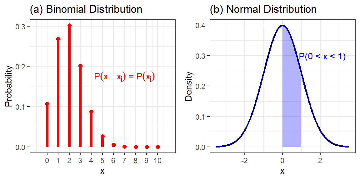 Figura 1.5: Probabilidade em (a) distribuição discreta e (b) contínua