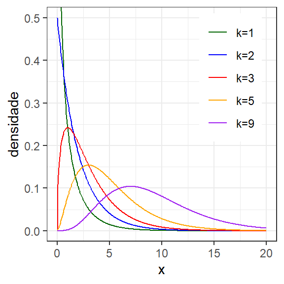 A distribuição da variância amostral \(s^2\) é de interesse em muitos problemas de inferência. A distribuição chi-quadrado, denotada \(\chi^2\), com \(k\) graus de liberdade é utilizada para descrever a soma dos quadrados de \(k\) vas normais-padrão independentes, \(z_i \sim N(0,1)\), conforme segue. Uma vez que, ao calcular a variância amostral, conforme a Equação 1.6, toma-se a soma dos quadrados dos desvios das observações em relação à média, isto é, a soma dos quadrados de vas normais-padrão, pode-se inferir que a variância é distribuída pela va segue a distribuição \(\chi^2\).