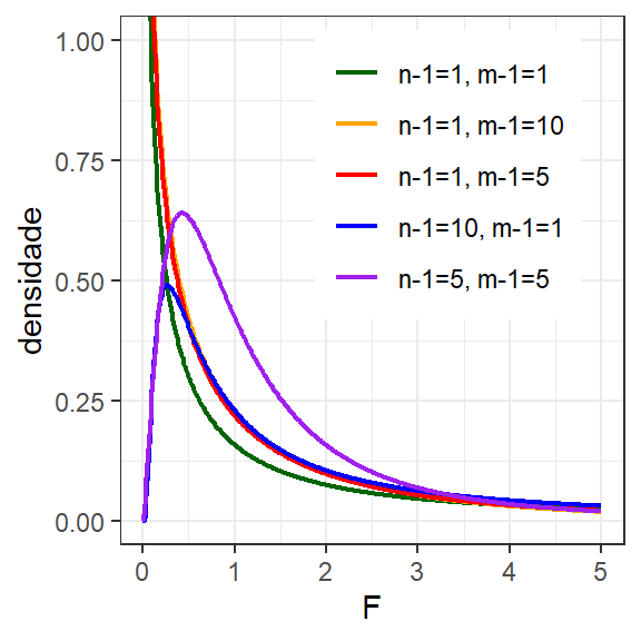 segue a distribuição \(F\) de Fisher-Snedecor com \(n-1\) e \(m-1\) graus de liberdade. A razão entre variâncias pode seguir esta distribuição mesmo se as populações de origem apresentam desvios de normalidade. Analogamente à distribuição \(t\), a distribuição \(F\) deriva da normal, sendo um caso específico da distribuição \(F\) derivado da distribuição \(t\). A distribuição \(F\) apresenta domínio \(F \in [0, +\infty)\), por descrever a razão entre variâncias, sendo também assíntota. A Equação 1.13 descreve a função densidade de probabilidade F, com \(p=n-1\) graus de liberdade e \(q=m-1\) graus de liberdade. Esta fdp é plotada com variação dos graus de liberdade na Figura 1.11.