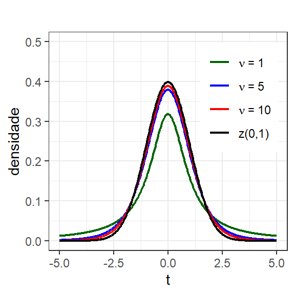 Para obter um gráfico da fdp da distribuição \(t\) pode-se utilizar um código similar ao que segue.