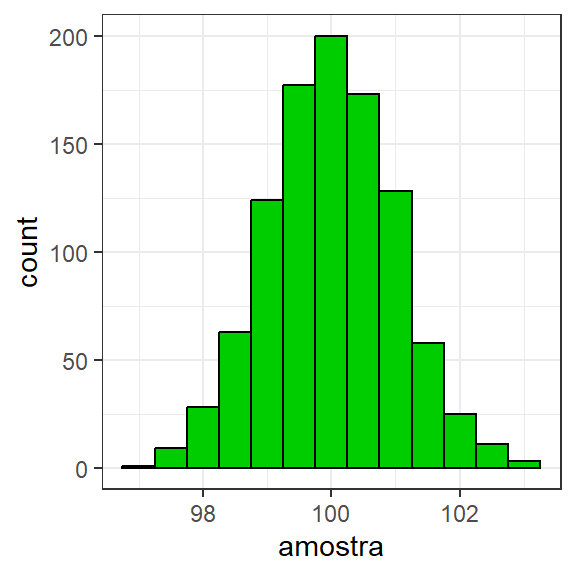 Figura 1.2: histograma de uma amostra com n = 1000 observações retirada de uma população \(N(100,1)\)
