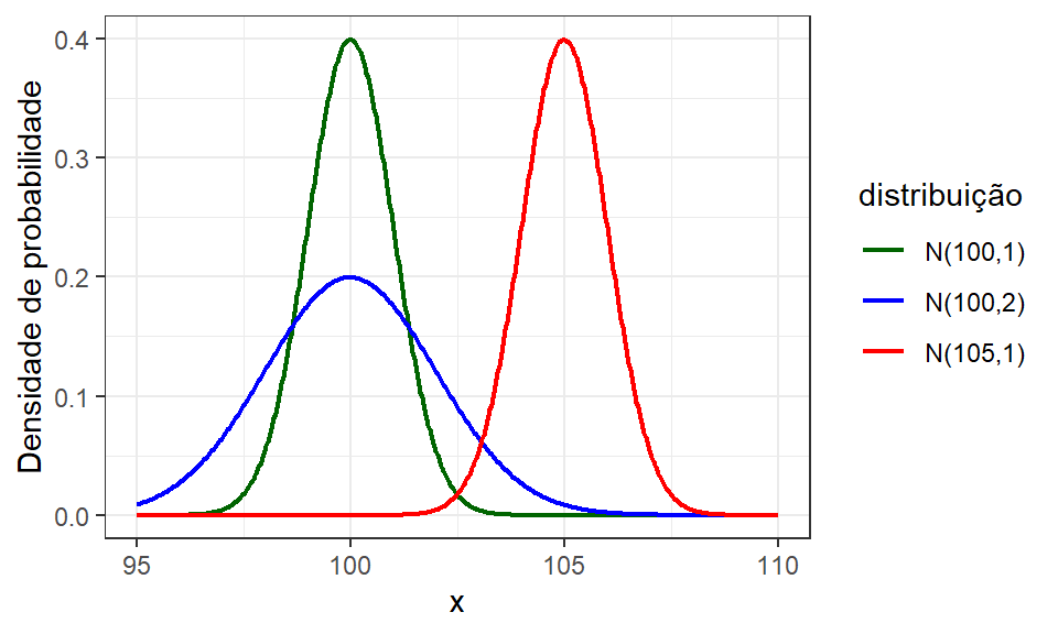 # Carregar a biblioteca ggplot2library(ggplot2)theme_set(theme_bw())# Dados para eixo horizontalx <-seq(from =95, to =105, length =500)# Avaliando cada valor de x na fdp da distribuição normaly <-dnorm(x = x, mean =100, sd =1)# Criar um data frame para o ggplotdata <-data.frame(x = x, y = y)# Plotando a fdp com ggplot2ggplot(data, aes(x = x, y = y)) +geom_line() +ylab("densidade")