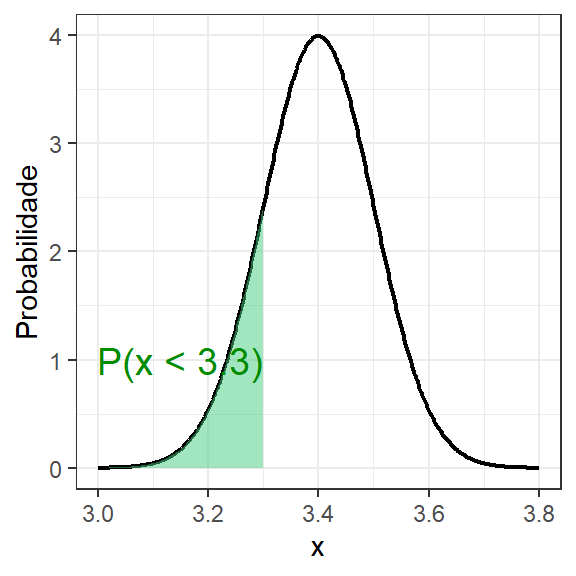 No R é fácil calcular esta probabilidade através do comando pnorm, conforme segue. Logo, \(P(x < 3,3) = 0.1586553\). A Figura 1.6 ilustra esta probabilidade.