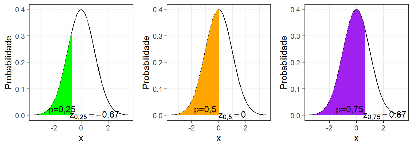 A Equação 1.9 expõe a função densidade de probabilidade da distribuição normal padrão \(z\). O coeficiente \(\frac{1}{\sqrt{2\pi}}\) garante que a área sob a curva seja unitária. A probabilidade à esquerda de um valor de interesse é denotada \(\Phi(\zeta) = P(z \leq \zeta)\), sendo calculada conforme a Equação 1.10. A Figura 1.7 ilustra três exemplos com probabilidade de 0,25, 0,5 e 0,75.
