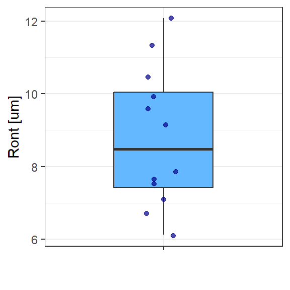 Exemplo 2.1 Considere uma amostra de 12 observações da circularidade total \(Ron_t\) de furos obtidos por fresamento helicoidal em peças de aço inox superduplex UNS S32760. A Figura 2.1 apresenta um boxplot de Ront. Um engenheiro ou pesquisador pode desejar inferir se a média de Ront é menor que 10 \(\mu m\) por considerar este limite superior de especificação para uma determinada aplicação.