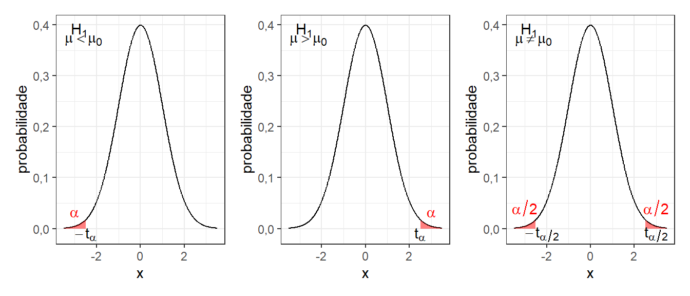 Tomando a curva sob a hipótese nula \(H_0\), na Figura 2.4, pode-se definir \(\beta\) como a probabilidade de o valor calculado \(t_0\) estar à direita do valor \(t\) ilustrado, sendo este t relacionado à curva de \(H_0\), isto é, \(-t_{(\alpha,n-1)}\), negativo, uma vez que está à esquerda de \(\mu_0\).