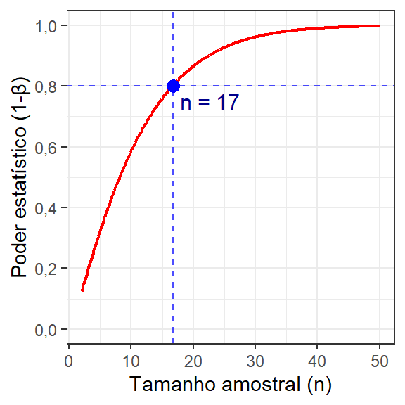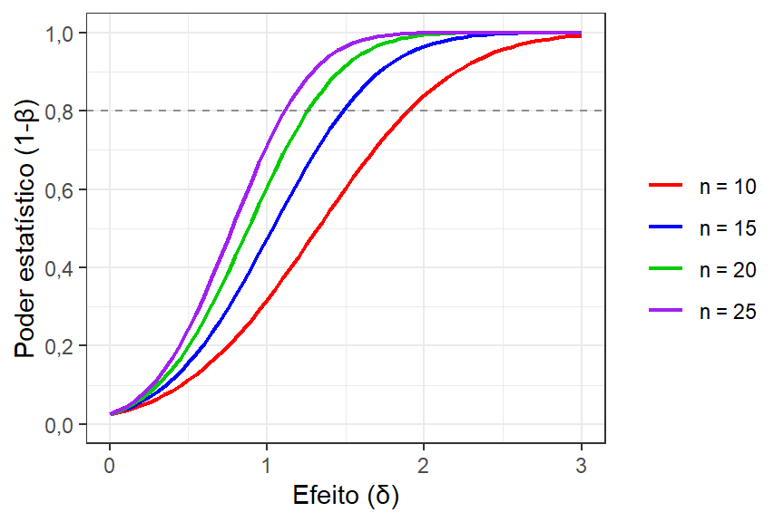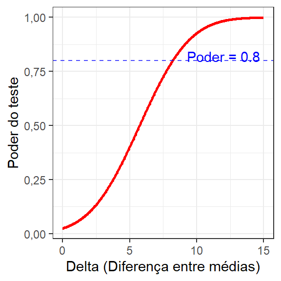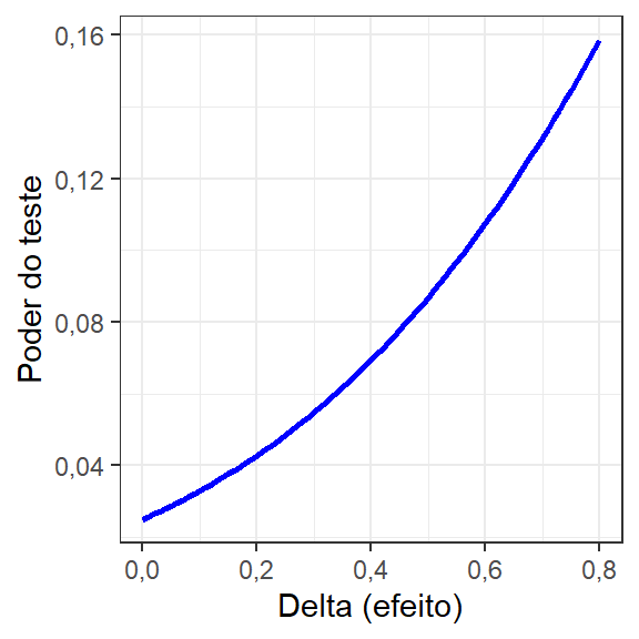 A Figura 2.18 apresenta a curva de poder do teste em função do deslocamento a ser detectado para o Exemplo 2.3. A alta diferença entre médias, relativamente aos desvios-padrões amostrais, garantiu \(1-\beta \backsimeq 1\) no Exemplo 2.3.