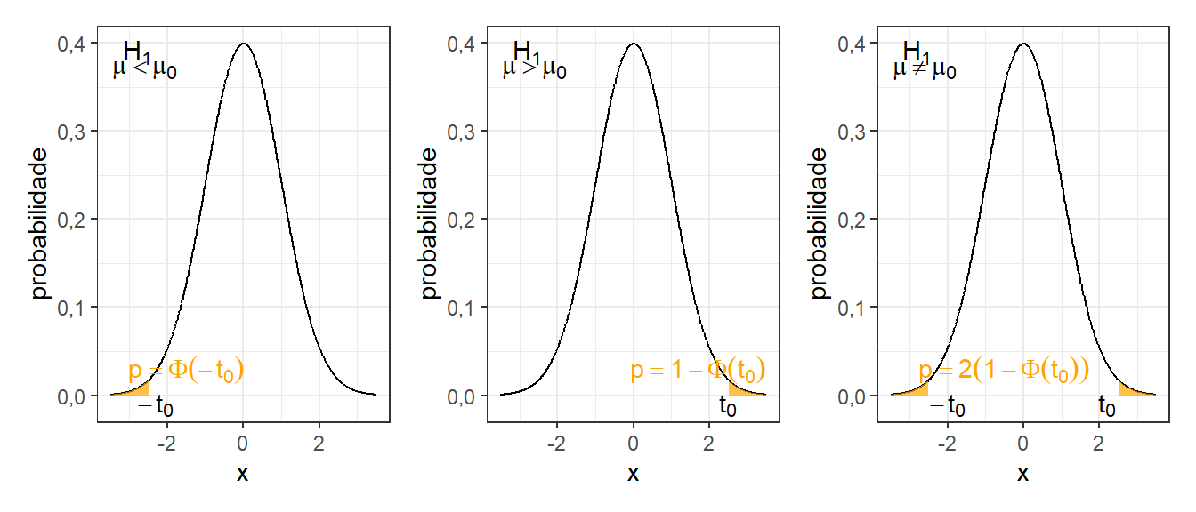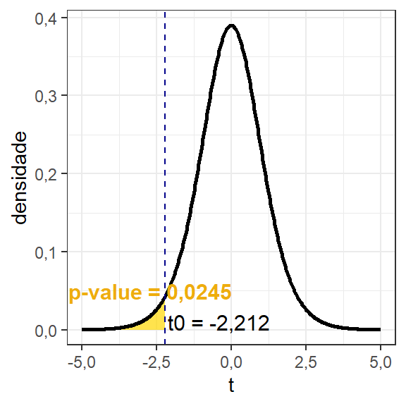Sendo o p-valor a probabilidade associada ao valor calculado, ele também pode ser utilizado na tomada de decisão em inferência. A Figura 2.3 ilustra o p-valor, sendo neste caso a área sob a curva à esquerda do valor calculado \(t_0\), isto é \(pvalor = P(t < t_0) = \Phi(t_0)\). Pode-se constatar que, para hipóteses unilaterais à esquerda, \(H_1: \mu < \mu_0\), se \(t_0 < t_\alpha\) implica em \(p-valor < \alpha\). Quanto menor o p-valor, maior a evidência na rejeição da hipótese nula. Caso o analista queira obter o p-valor utilizando a função pt base do R, pode-se utilizar o código à seguir.
