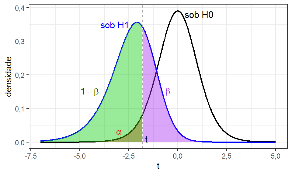 De modo análogo, pode-se definir \(\beta\) considerando a curva sob a hipótese alternativa \(H_1\), na Figura 2.4, que neste suposto caso corresponde à realidade.