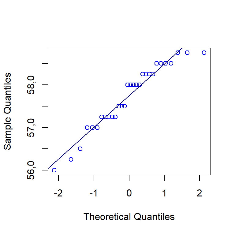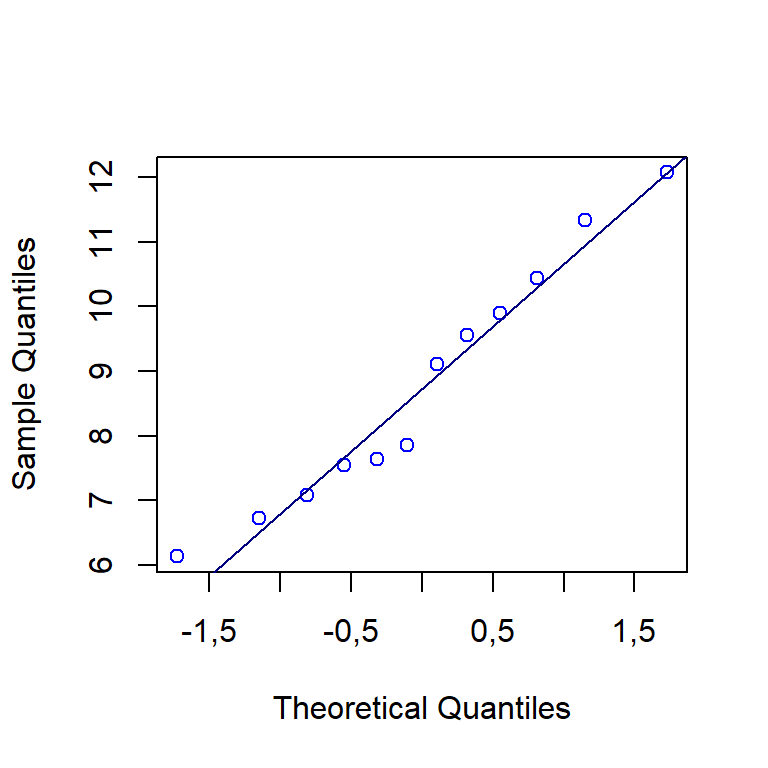 # qqline(d)Finalmente o teste \(t\) pareado é realizado através do código à seguir. Pode-se constatar que, como \(p-valor = 0,8562 > 0,05 = \alpha\), não se rejeita a hipótese nula de igualdade entre os métodos de preparação da amostra para medição de umidade do carvão vegetal. Como conclusão prática, não é necessário triturar o carvão para medir sua umidade.