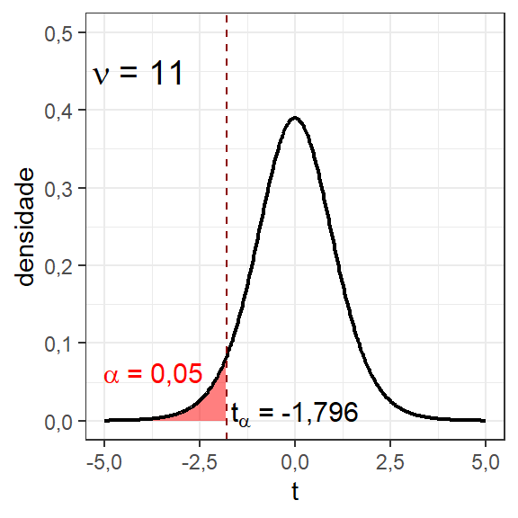 Considerando a distribição \(t\) com 11 graus de liberdade, pode-se obter o valor \(t_\alpha\), o qual garante uma probabilidade igual a 0,05 à sua esquerda, conforme segue. Este valor \(t_\alpha\) é comumente conhecido como valor crítico.
