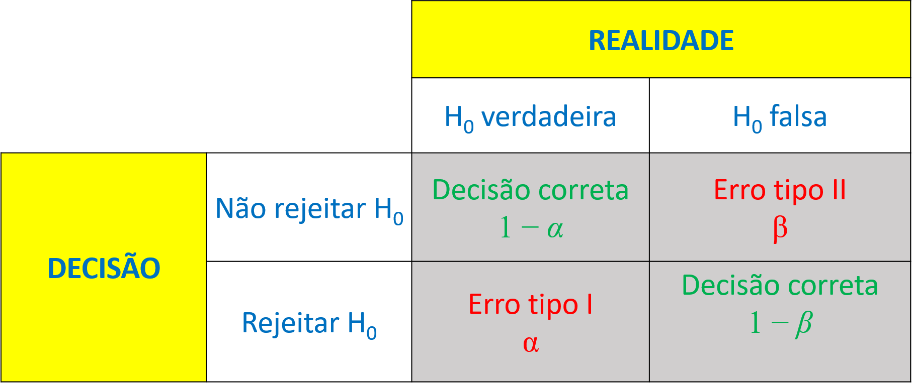 A probabilidade \(1 -\beta\) ilustrada na Figura 2.4 é chamada de poder do teste. O poder do teste consiste na capacidade do teste estatístico de detectar um deslocamento na média, isto é, de rejeitar a hipótese nula, quando ela é falsa, não cometendo o erro do tipo II. A Figura 2.5 apresenta as possibilidades quanto à decisão em testes de hipóteses em relação à realidade, que supõe-se desconhecida por parte do analista. Ao recomendar \(\beta =0,2\), procura-se um poder do teste \(1- \beta = 0,8\).