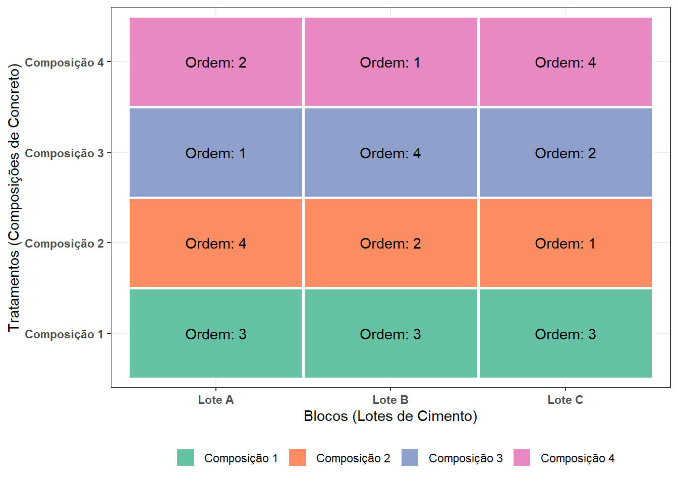 Existem diveros exemplos de variáveis de ruído presentes em processos industriais e experimentais que podem ser blocadas. Por exemplo, considere o caso onde deseja-se testar o efeito de distintas composições de concreto para aplicação estrutural e não há cimento (ou outra matária-prima) suficiente de um mesmo lote para fazer todas replicações das composições (ou tratamentos) de interesse. O ideal neste caso seria realizar uma replicação com todas as composições fabricadas de forma aleatória com cimento de um lote A, outra replicação com todas as composições fabricadas de forma aleatória com cimento de um lote B e assim sucessivamente. A intenção neste caso seria se precaver de uma possível variabilidade adivinda da diferença entre lotes de cimento. Pode ser que o fabricante garanta o atendimento das especificações do produto e, portanto, mínima variabilidade entre lotes, porém até mesmo o tempo de armazenamento, pode ser fonte de variabilidade neste tipo de produto. O ideal seria usar para todo o rpocedimento o mesmo lote, mas se não é possível a técnica de blocagem será útil para retirar do erro experimental a variabilidade da matéria-prima. A Figura 4.1 ilustra tal delineamento considerando 4 composições de concreto (tratamentos), 3 lotes de matéria-prima e, portanto, 3 réplicas. Os 4 tratamentos devem ser conduzidos de forma aleatória dentro dos blocos.