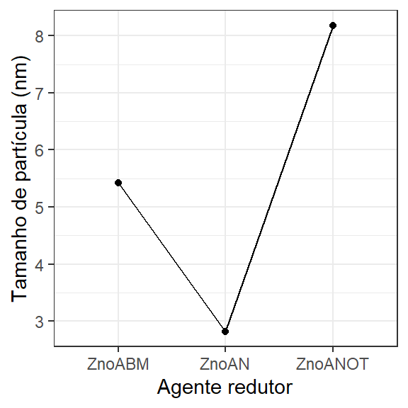 Para realizar a análise de variância é utilizado o comando aov(). Pelos resultados, como \(F_0 = 12,057 > 4.45897 = F_{(0,05;2;8)}\), ou como \(p-value = 0.00385 < 0,05 = \alpha\), rejeita-se \(H_0\). Deste modo, há ao menos um dos tratamentos com efeito diferente, de forma que há influência do tipo de agente redutor no tamanho da partícula. É importante notar também que o efeito do método de medição, que consiste neste caso na variável blocada, foi estatísticamente significativo, deixando claro a diferença entre tais métodos e, portanto, a necessidade de blocar tal fonte de variabilidade.