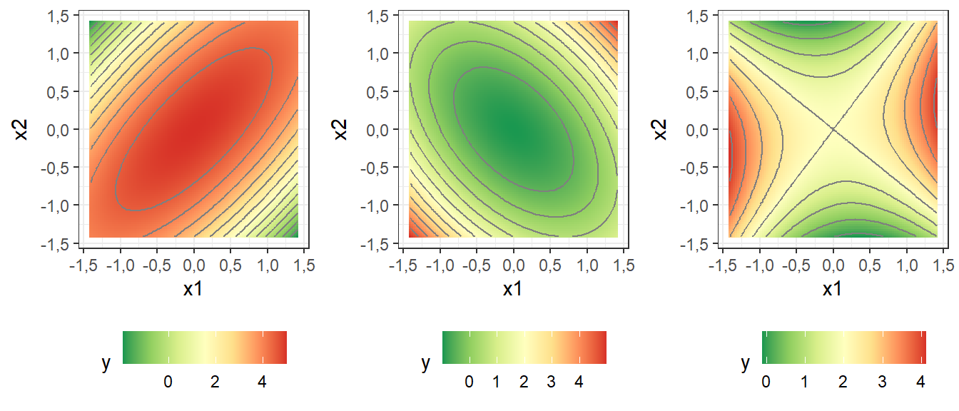 \[ y = \beta_0 + \sum_{i=1}^k \beta_i x_i + \sum_{i=1}^k \beta_{ii} x_i^2 + \sum_{i < j} \beta_{ij} x_i x_j + \varepsilon \tag{7.2}\]