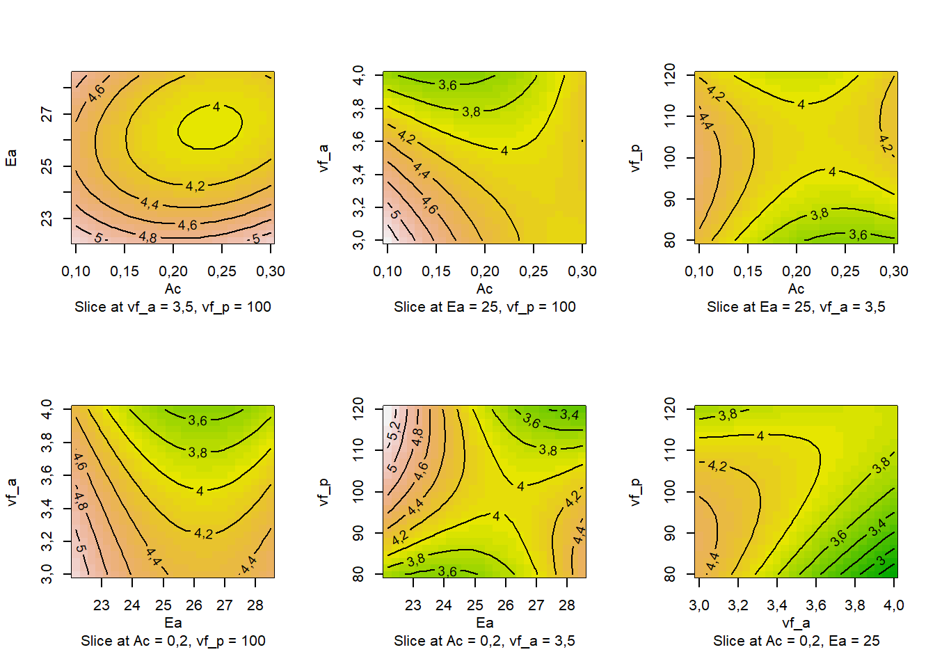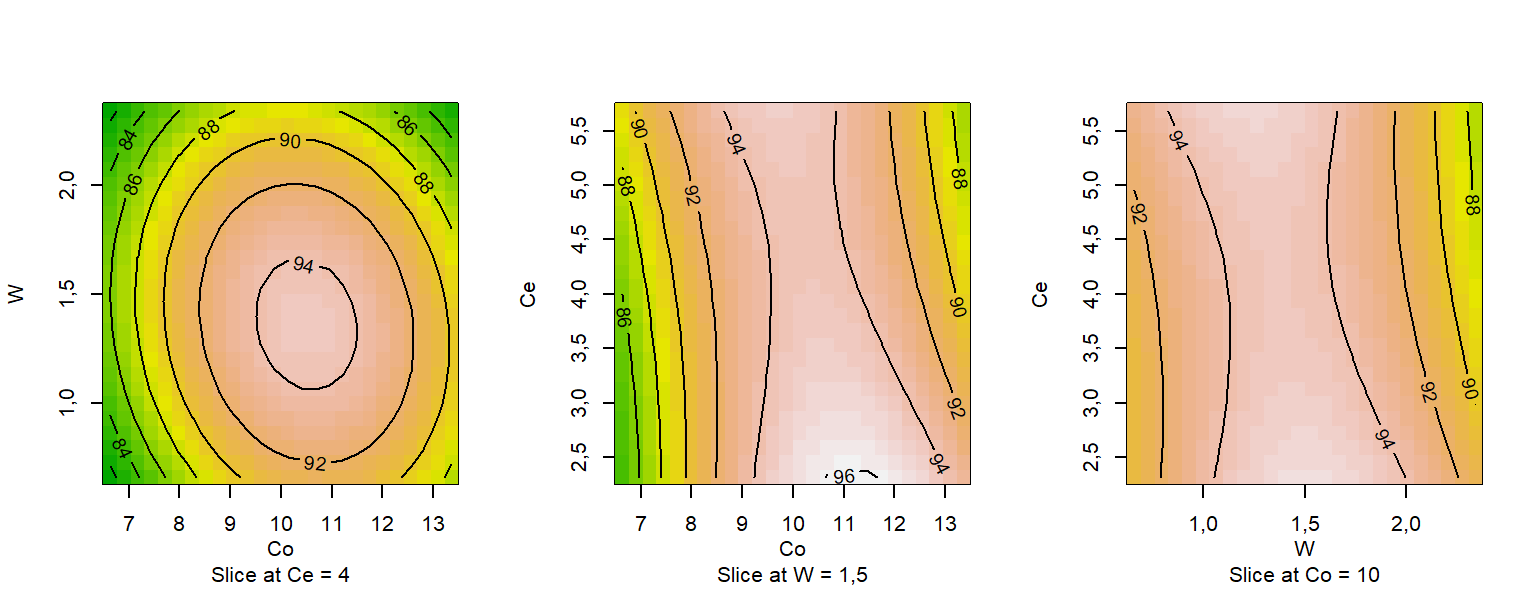 O modelo final, após reparametrização, fica conforme Equação 7.2. Os termos quadráticos, \(\beta_{ii} x_i^2\), são a novidade em relação ao modelo obtido via fatorial \(2^k\). Este modelo é dito de segunda ordem completo, contendouma constante, \(k\) termos lineares, \(k\) termos quadráticos ou de segunda ordem puros e \(k(k-1)/2\) termos de interação de sgeunda ordem ou termos de segunda ordem mistos.