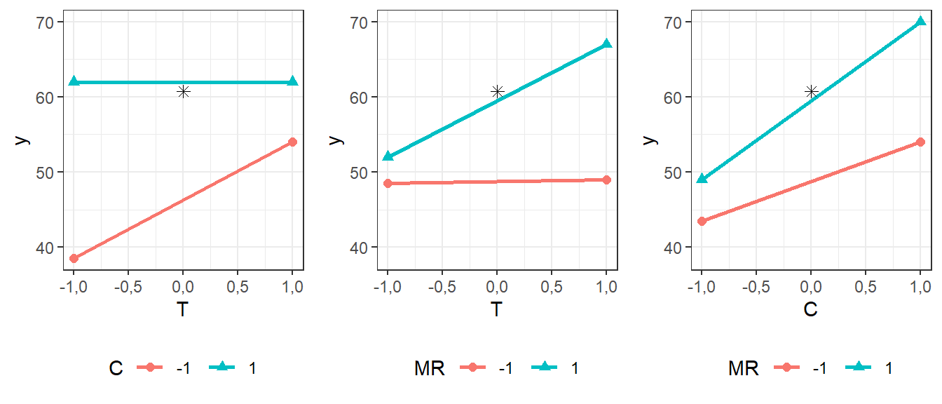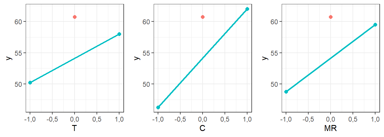 FrF2(nruns = 8, nfactors = 3, factor.names = c("T", "C", "MR"),
