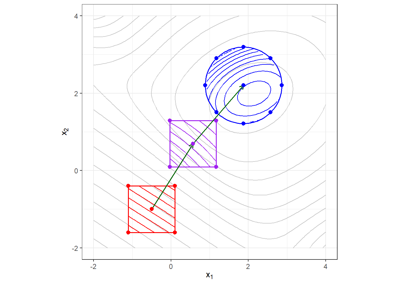 O procedimento para encontrar a superfície de resposta pode seguir estratégia sequencial, envolvendo experimentos iniciais de varredura, busca da região de curvatura, estimativa de um modelo de superfície de resposta, até a obtenção das condições ótimas operacionais. Por exemplo, supondo um caso bidimensional com domínio experimental amplo, conforme observado na Figura 7.1, observa-se em cinza uma suposta função desconhecida de interesse. Para fins de modelagem e otimização, supõe-se inicialmente que o analista selecione a região delimitada pelo quadrado vermelho para um primeiro planejamento fatorial \(2^k\) com pontos centrais. A definição de uma região inicial pequena é razoável, visto que uma aproximação quadrática não seria suficiente para uma região ampla e complexa. Obtém-se para esta região um modelo linear. Define-se a direção de máximo crescimento da resposta a partir do gradiente da função linear estimada. Realiza-se outro planejamento fatorial \(2^k\) com pontos centrais. Obtém-se outro modelo linear e, analogamente, define-se a direção de máximo crescimento da resposta via gradiente. Finalmente, na terceira região a ser explorada, como o teste de curvatura realizado via fatorial \(2^k\) com pontos centrais indicou curvatura significativa, completa-se o planejamento com mais pontos e novos experimentos, definindo um planejamento com região circular observada em azul, viabilizando a obtenção de um modelo quadrático passível de otimização.