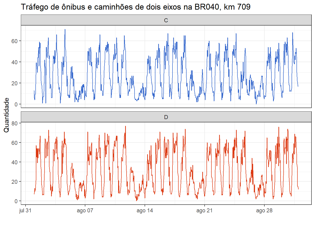 A Figura 1.4 expõe a série temporal com frequência horária do volume de ônibus e caminhões de dois eixos trafegando na Br040 no quilômetro 709 nos meses de agosto e setembro de 2025. São plotadas as séries no sentido crescente (C) e decrescente (D). A série está disponível em dados do plano nacional de contagem de tráfego. Observa-se padrões sazonais diário e semanal. O primeiro dia do mês de agosto de 2023 foi uma terça-feira. A partir da primeira hora do dia observa-se o crescimento do volume de veículo até um pico de tráfego próximo de 60 veículos com posterior decréscimo com o avançar da noite até um volume mínimo bem próximo de zero. O padrão diário se repete, porém, com menor volume nos fins de semana. O padrão semanal é identificado pela repetição de cinco ciclos de maior fluxo, caracterizando os dias de semana, e dois com menor fluxo, consistindo nos fins de semana.