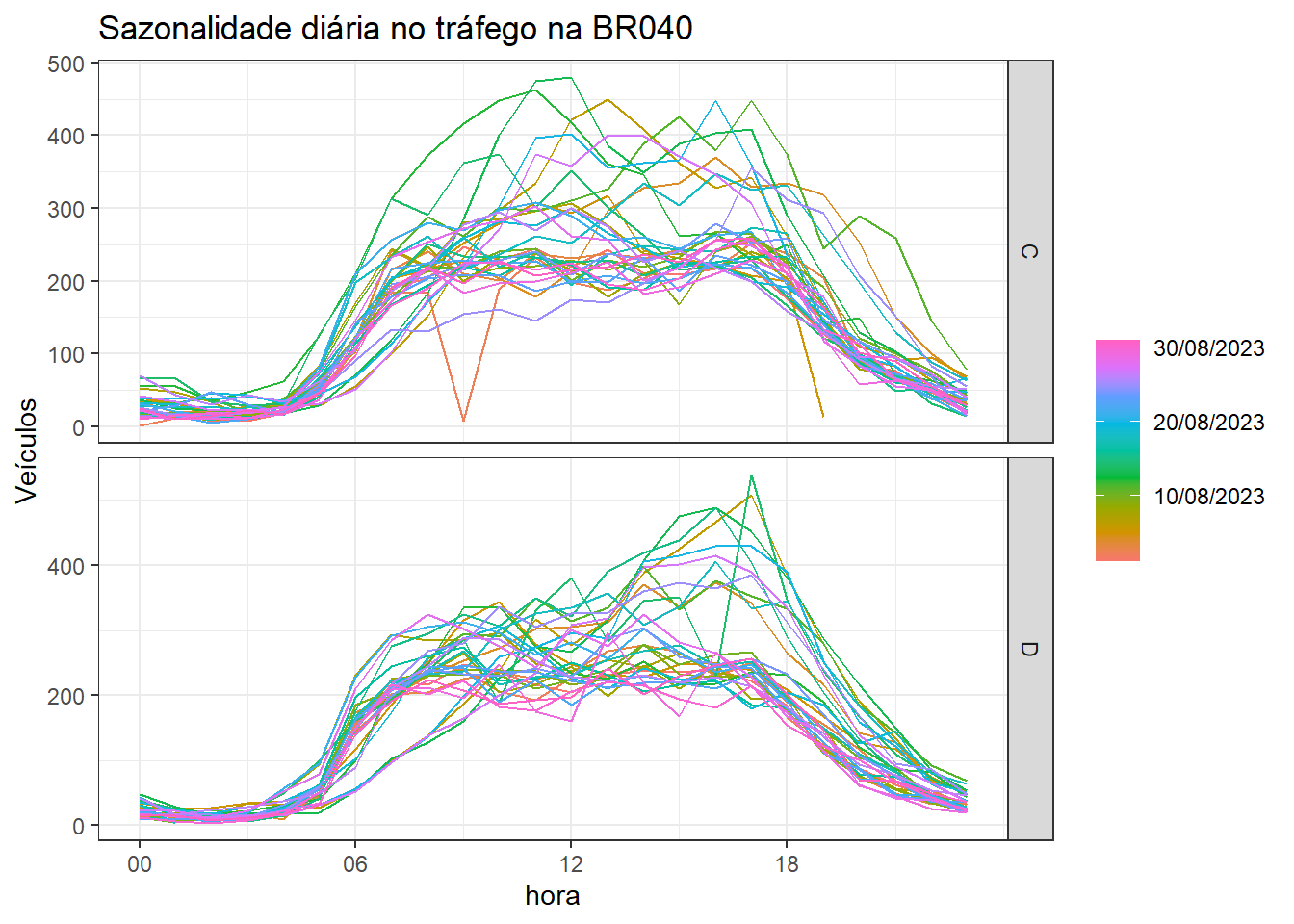 É possível visualizar padrões sazonais de forma distintas. Sejam os dados de tráfego de veículos de passeio na BR040 no quilômetro 709. A Figura Figura 1.8 ilustra um gráfico de sazonalidade diária para o mês de agosto de 2023 para ambos sentidos de tráfego. Os dias são plotados em escala de cor, enquanto o horizonte diário em horas é plotado no eixo horizontal. Observa-se um tráfego mais baixo nas primeiras horas do dia, com aumento no volume de 3 às 9 da manhã, estabilidade durante a manhã e decréscimo com o início da noite. É possível observar também que para a maior parte dos dias o volume de tráfego nas horas mais movimentadas tem pico em 250 veículos. Porém há dias com volume maior.