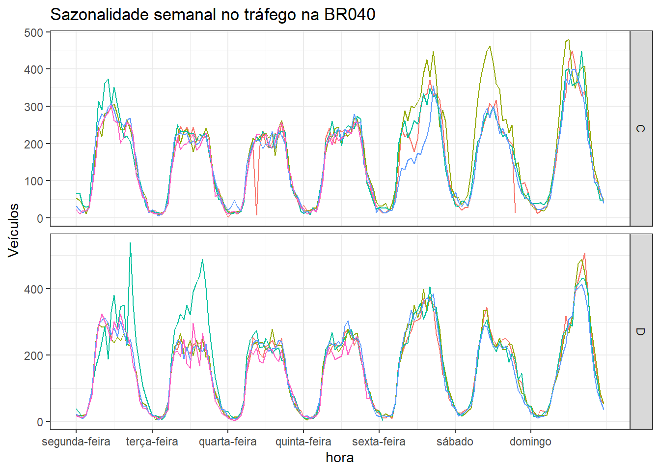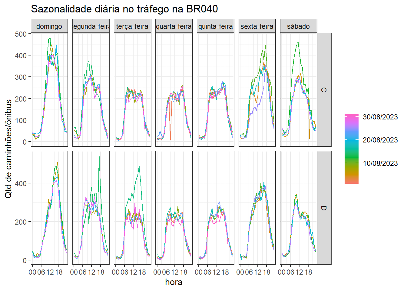 Para uma melhor visualização sejam os dias de semana separados em distintos painéis, conforme Figura Figura 1.9. Observa-se agora mais claramente o padrão para cada dia de semana. Domingos são os dias mais movimentados considerando este tipo de veículo. De terça a quinta o tráfego apresenta padrão similar.