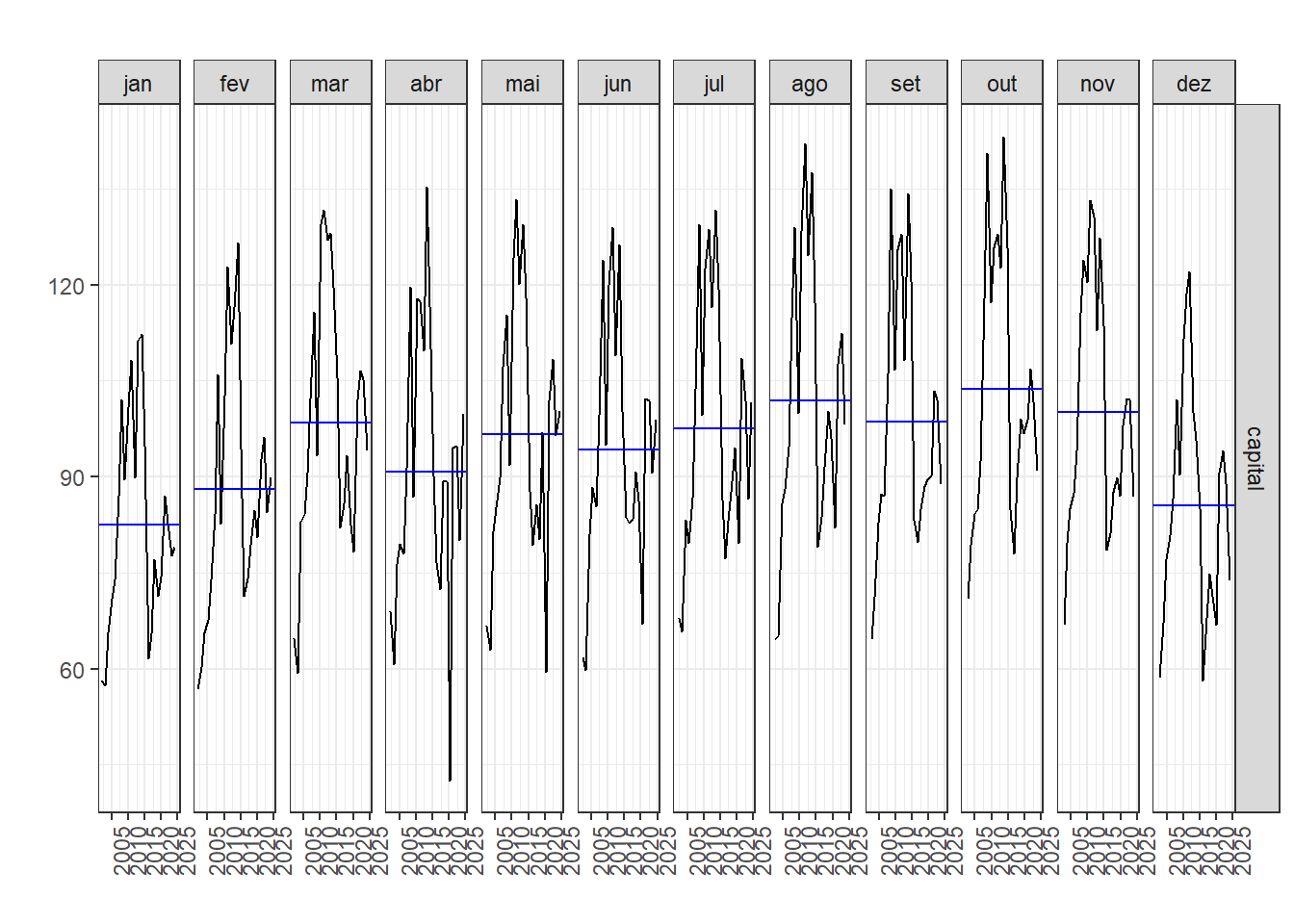 Um gráfico de subsérie sazonal considera uma unidade de tempo em distintos painéis e um múltiplo desta unidade no eixo horizontal. A Figura Figura 1.12 plota tal gráfico para a série de índice de bens de capital. As linhas horizontais em azul consistem nas médias mensais, permitindo observar a variação ao longo do ano considerando tais médias. Já a subsérie observada em cada painel permitem observar a tendência ao longo dos anos dentro de cada mês. Para este índice, independente do mês observa-se um aumento na produção de bens de capital até 2013/2014, seguido de queda e posterior recuperação seguida de nova queda, provavelmente devido à pandemia de COVID-19.