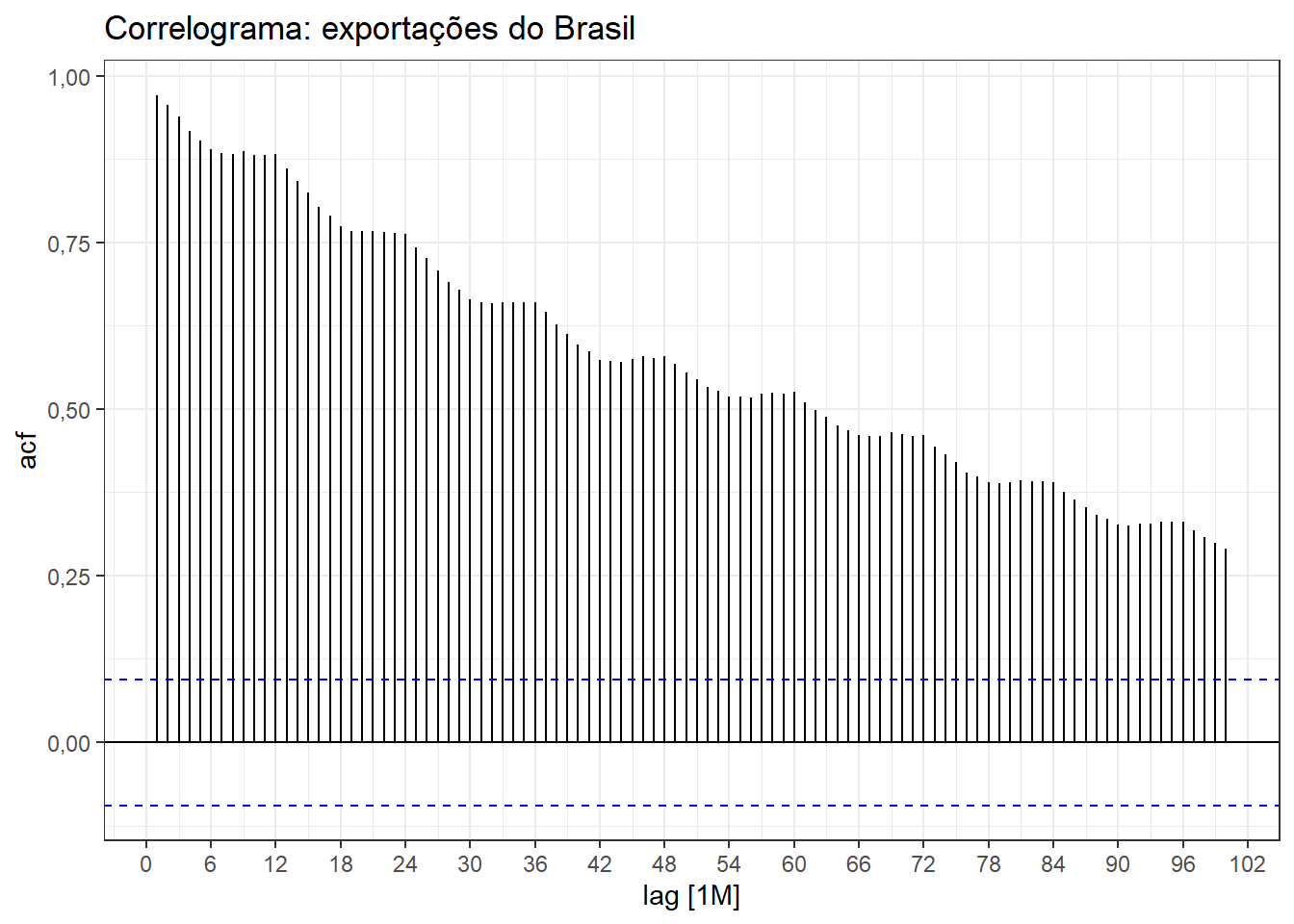 A Figura 2.3 plota o correlograma da série de exportações. As linhas horizontais tracejadas azuis consistem nas linhas que determinam a significância estatística das autocorrelações, de forma que as que estão acima destas, são significativas. Tais limites são calculados como \(\pm 1,96 /\sqrt{T}\), onde \(1,96\) consiste no valor do quantil na distribuição normal-padrão \(z\), com 0,95 de probabilidade ou confiança.