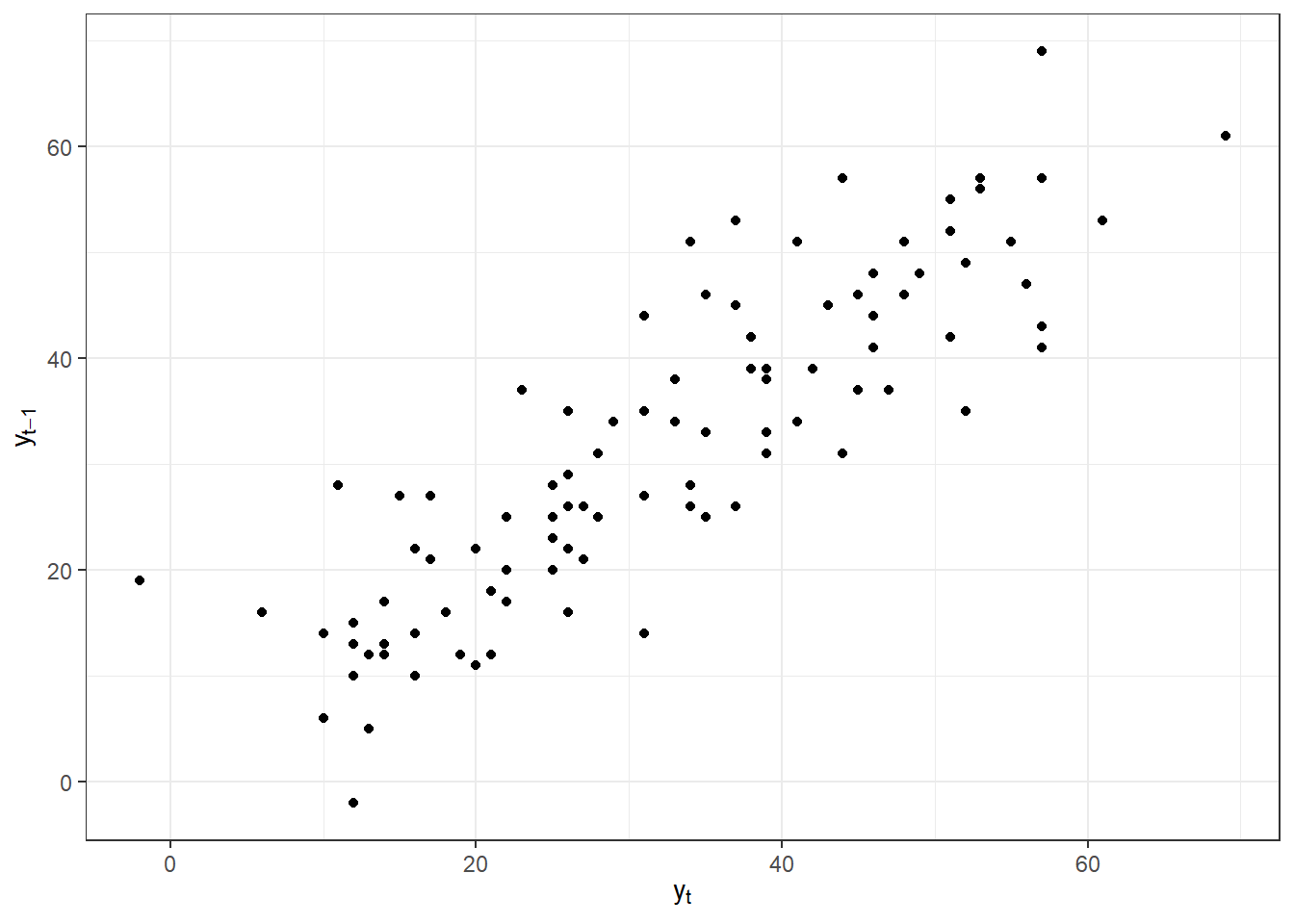 A Figura 2.1 expõe o diagrama de dispersão da série arbitrária \(y_t\) da Tabela 2.3 e da mesma série defasada de uma observação, \(y_{t-1}\). Observa-se que há uma relação linear positiva entre a série completa e a mesma defasada de uma observação, sugerindo que a série defasada explica boa parte da variação da série original. A autocorrelação mede tal relação.
