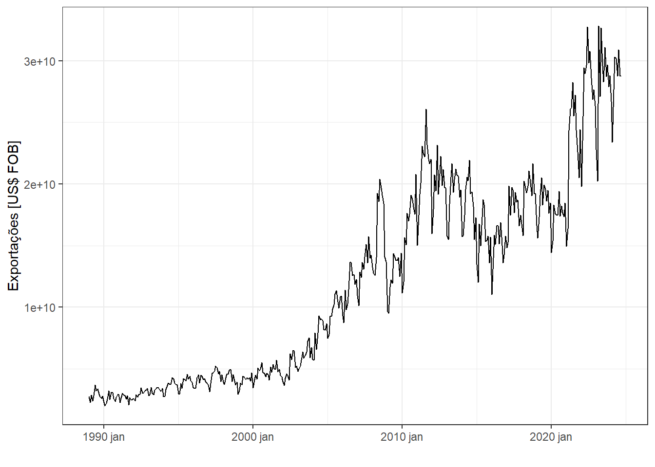 Seja a série temporal de exportações do Brasil em US$ FOB, disponível em Resultados do Comércio Exterior Brasileiro - Dados Consolidados plotada na Figura 2.2. Observa-se em geral tendência de crescimento com estagnação de 2016 a 2021 devido a crise político-econômica e a pandemia. Também é possível observar um padrão sazonal anual, com maior volume de exportações nos meses de maior atividade econômica em cada ano.