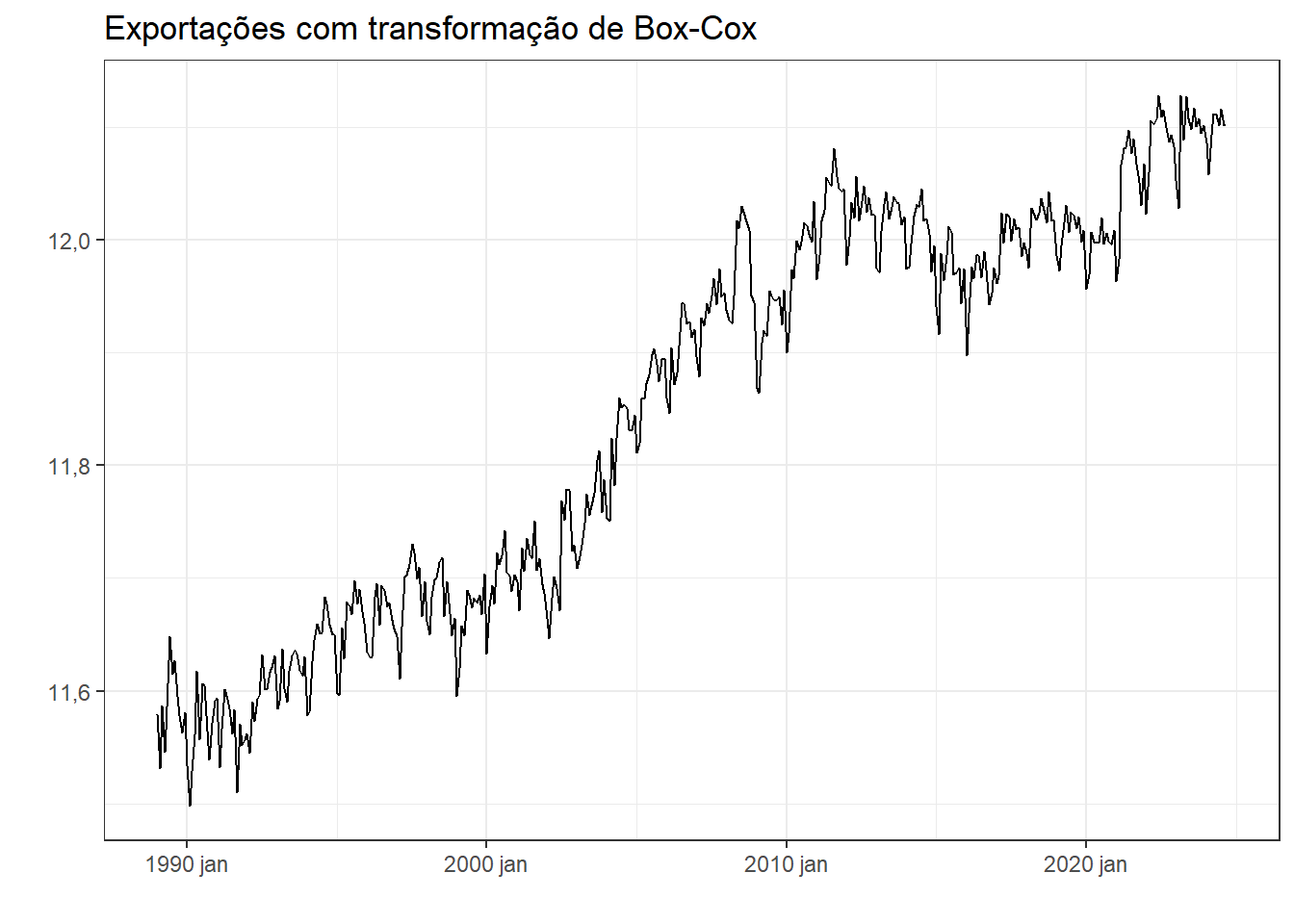 Q_Transformação de Box-Cox para a série de exportações. Deve-se usar a opção guerrero no argumento features do comando homônimo para aplicar o algoritmo de Guerrero (1993) para selecionar o lambda ótimo da transformção. Usa-se depois o comando box_cox com o lambda ótimo para transformação.