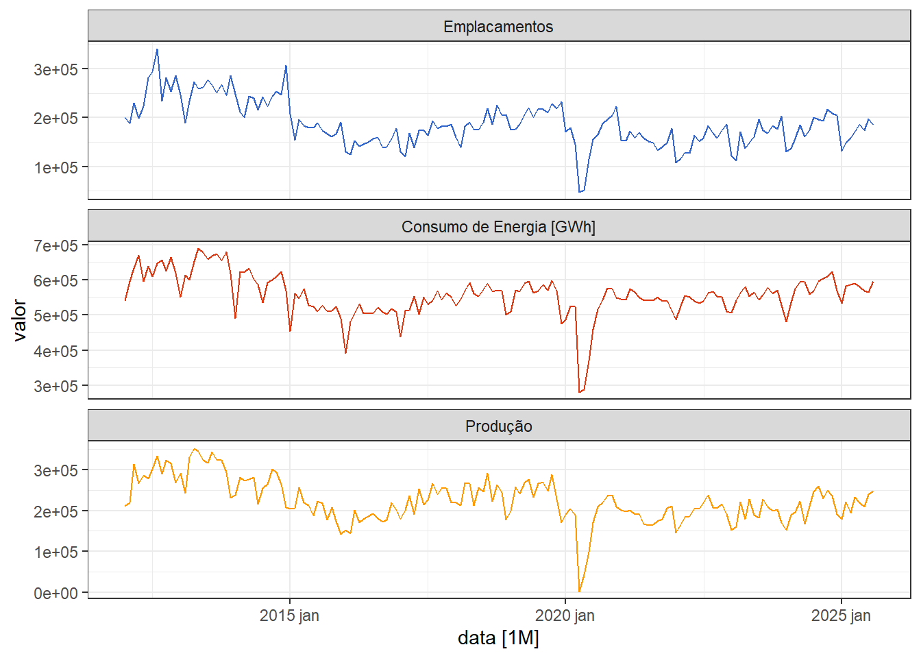 Box et al. (2008) e Pankratz (2012) discutem métodos de identificação de modelos de regressão dinâmica. Aqui sugere-se uma abordagem prática de identificação considerando a função de correlação cruzada (crossed correlation function - CCF) entre \(y_t\) e \(x_t\). Sejam as séries de produção total mensal de veículos automotores, do número de emplacamentos mensal e do consumo de energia mensal da indústria automobilística. As duas primeiras séries estão disponíveis em Anfavea e a terceira está disponível em Empresa de Pesquisa Energética. Tais séries são plotadas na Figura 7.11. Observa-se um padrão similar entre as séries. Observa-se também a queda em todas as séries devido a pandemia.