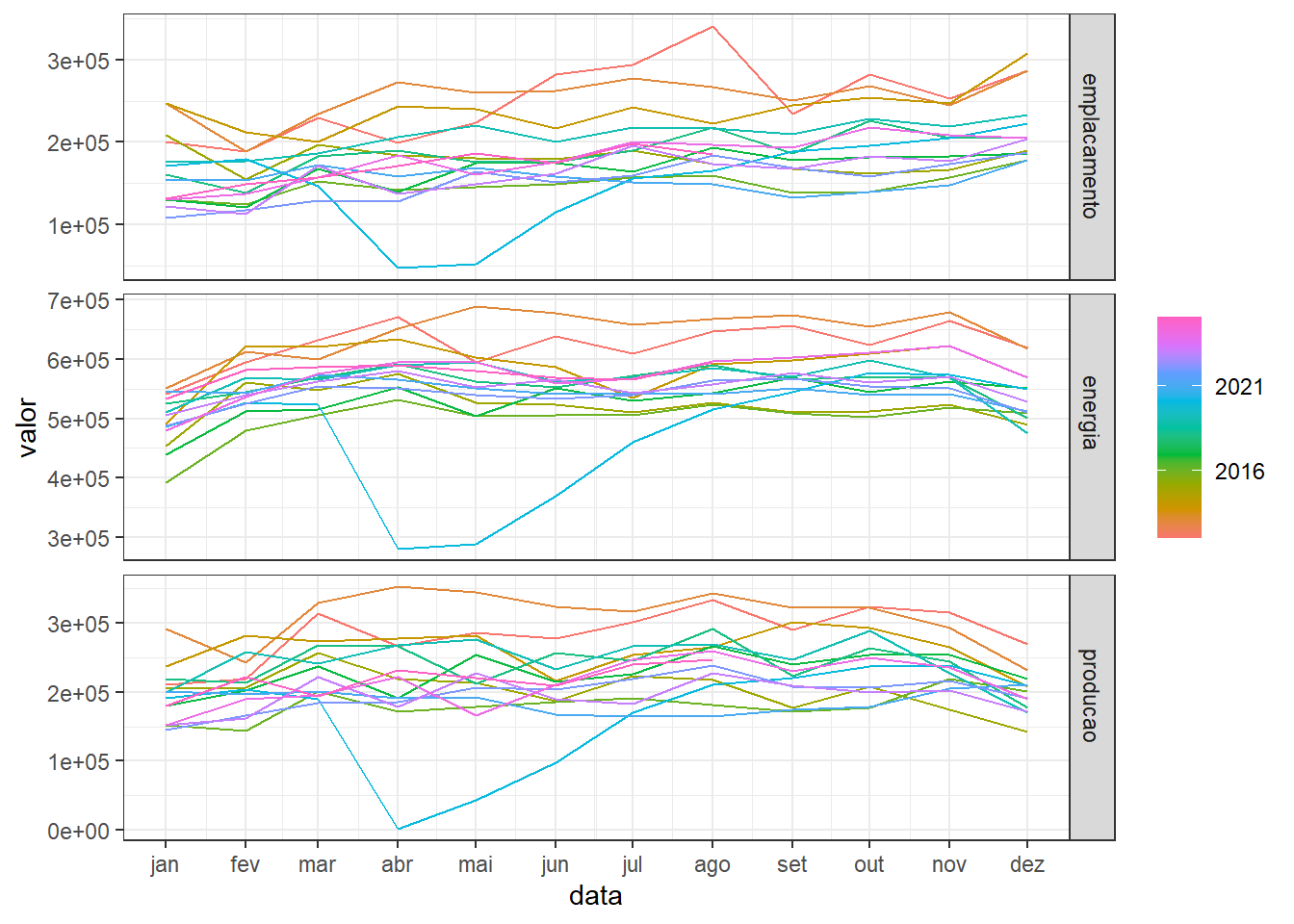 A Figura 7.12 expõe os gráficos sazonais das séries. Observa-se um padrão sazonal anual, com menor volume de produção e consumo de energia em janeiro e dezembro.