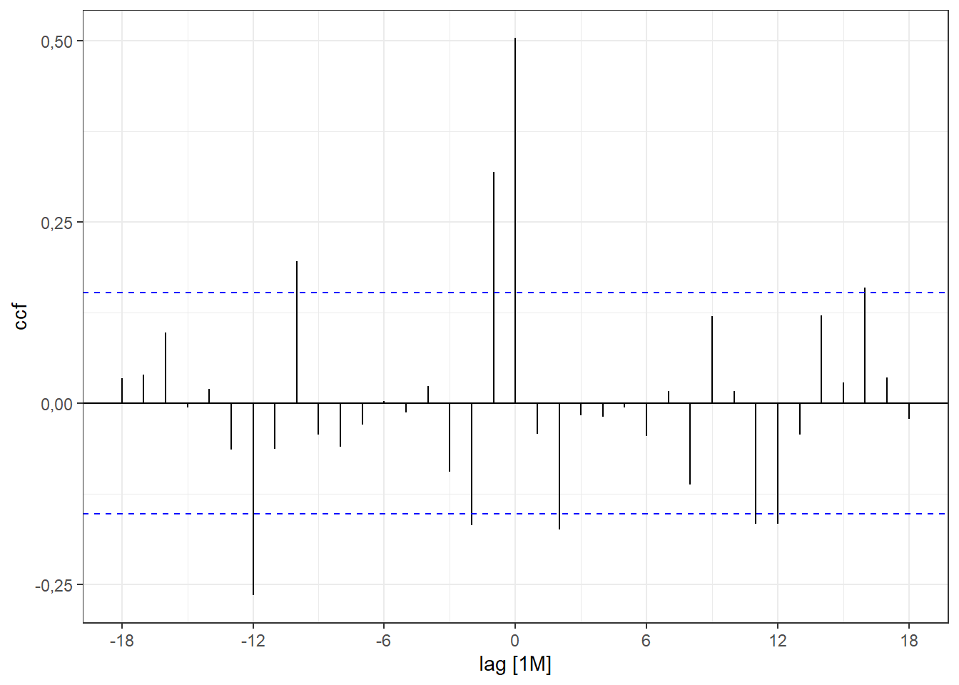 A correlação cruzada \(r_{xy,k}\) mede a correlação entre duas séries \(y_t\) e \(x_t\) com defasagem \(k\) entre as séries. Tal estimativa é importante, uma vez que visa mensurar em quais defasagens as séries de interesse se relacionam melhor. Em regressão dinâmica com defasagem distribuída é importante tal identificação, visando a sugestão de possíveis regressores defasados. A Equação 7.4 expõe o cálculo da função de correlação cruzada amostral.