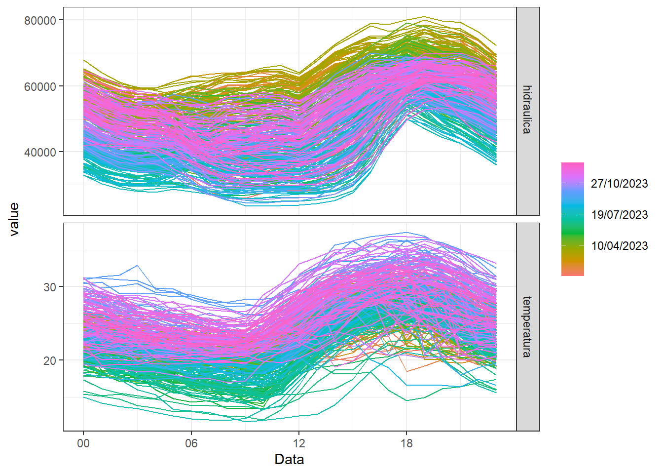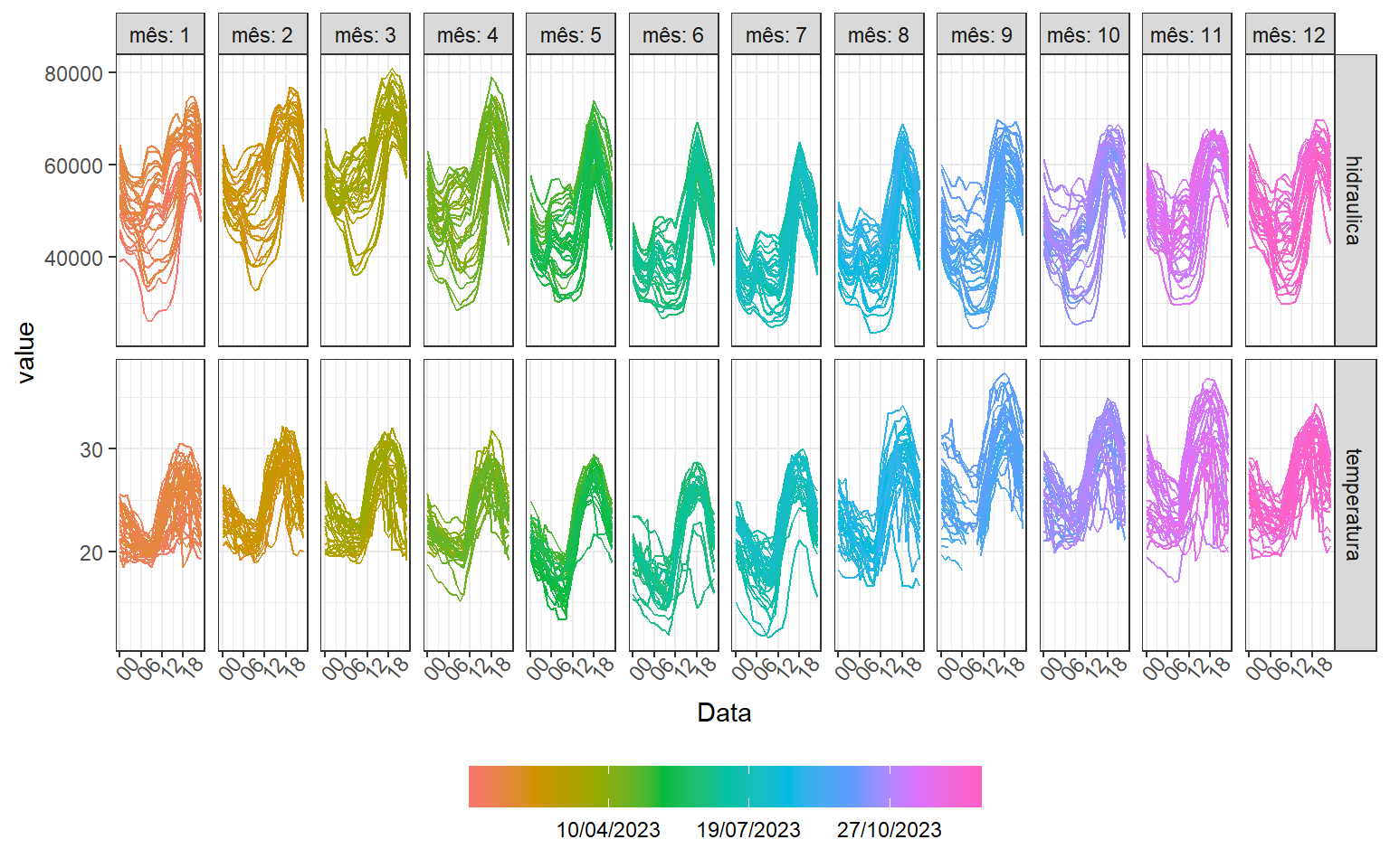 A Figura 7.20 expõe o gráfico de sazonalidade diária para as séries de consumo de energia elétrica hidráulica e de temperatura para o sudeste e centro oeste do Brasil. Observa-se ciclos muito similares para ambas as séries, com mínima pela manhã e máxima a tarde. Já a Figura 7.21 expõe outro gráfico sazonal com cada mês em um painel. É possível notar a sazonalidade diária, além da tendência da temperatura e do consumo de energia segundo as estações do ano.