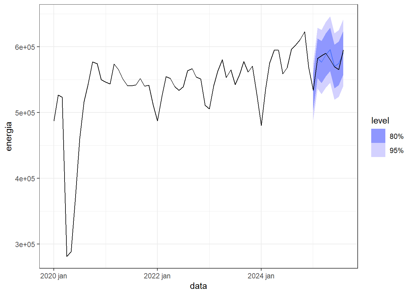 Por fim, a Figura 7.16 expõe a previsão para o modelo SARIMAx para os 6 primeiros meses de 2025. Observa-se excelente adequação às observações deste período. Como a previsão para este tipo de modelo depende da série regressora, neste caso a série de produção de veículos, pode-se trabalhar a previsão com cenários, conforme visto no capítulo 4. Uma proposta interessante para o caso do consumo de energia, seria trabalhar os cenários de produção considerando dados de planejamento da produção ou então aproximar via ARIMA ou outro método a série de produção e usar as previsões como cenários para o modelo SARIMAx. O exemplo proposto possibilitaria à indústria estimar a demanda energética a partir do planejamento da produção. Obviamente, estes dados são de estatísticas nacionais, mas, possivelmente, as séries específicas das montadoras nacionais apresentam padrões similares, viabilizando o emprego de tal abordagem.