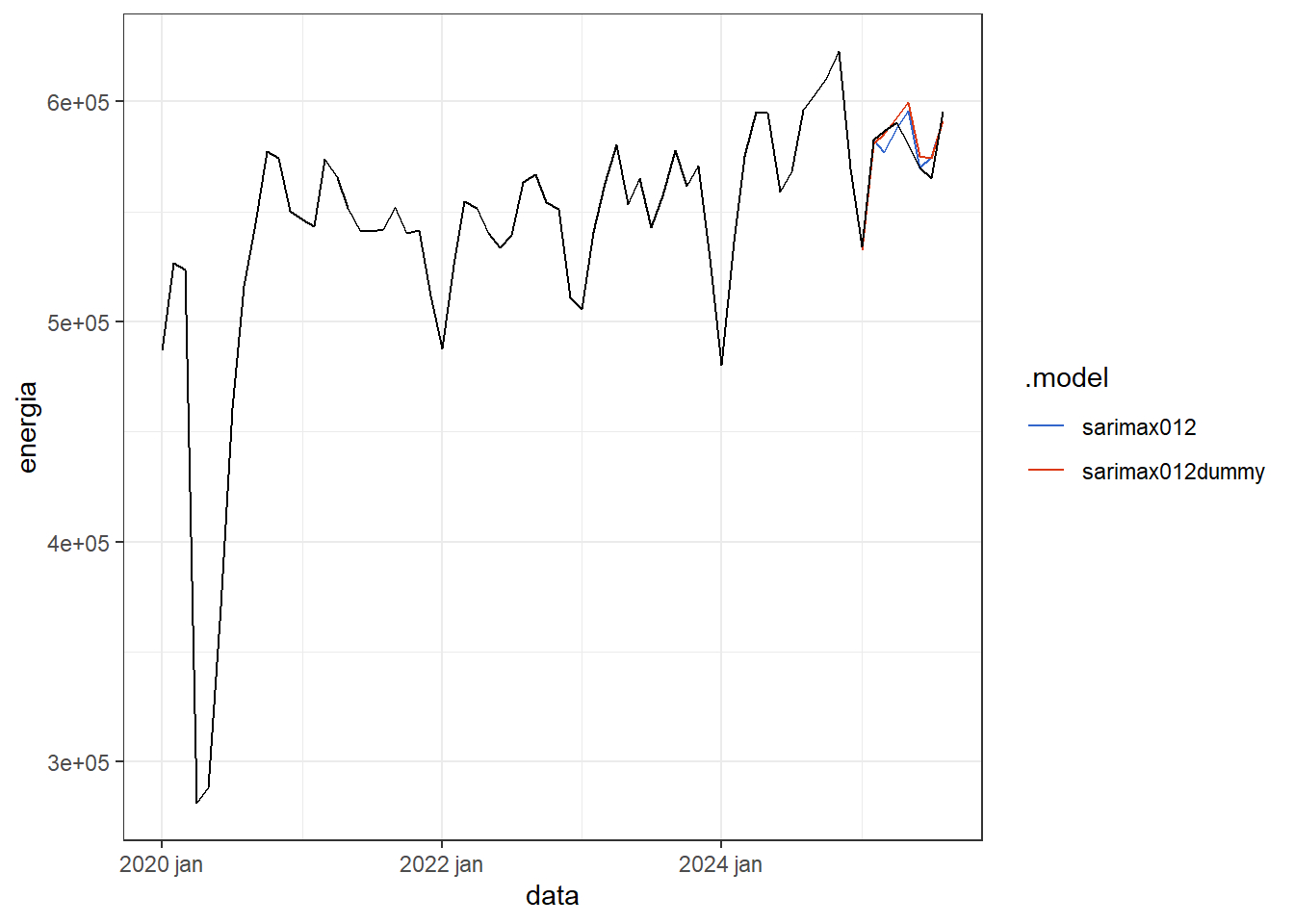 A Figura 7.18 apresenta a previsão para primeiro semestre de 2025 para os modelos sarimax012 e sarimax012dummy. Para o modelo com a variável binária, é importante definir os valores desta, no caso \(x_{t,dummy} = 0\), uma vez que não houve pandemia no período.