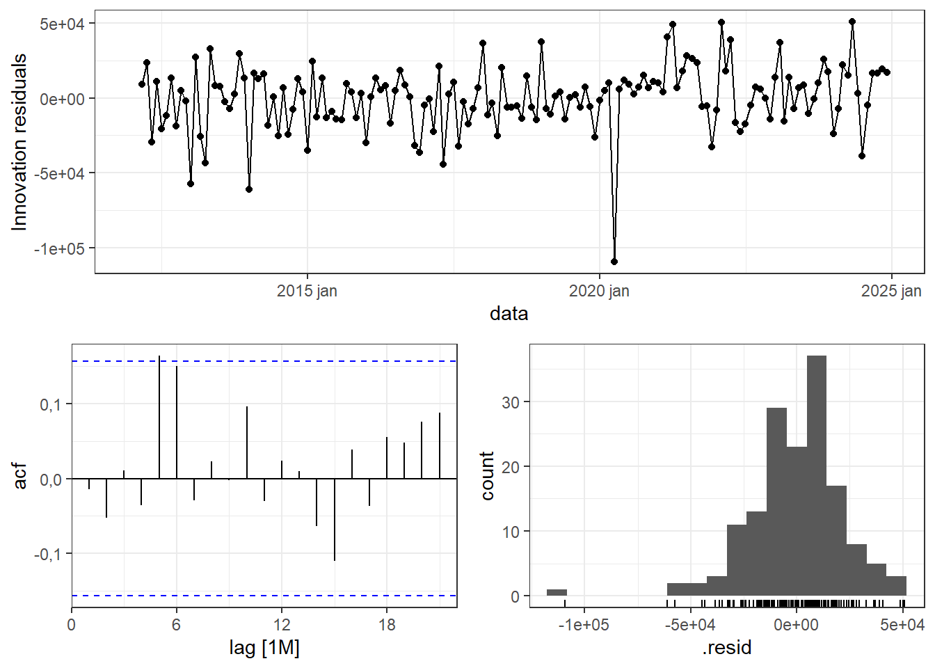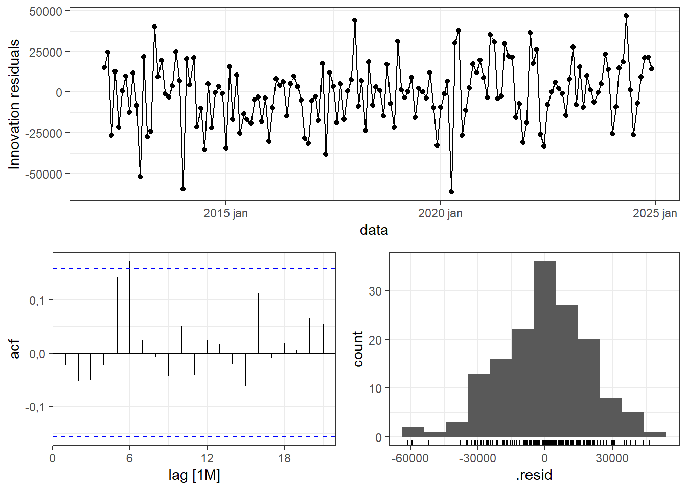 O modelo obtido pode ser expresso na Equação 7.5, com \(\eta\) seguindo um modelo autoregressivo de segunda ordem tanto para a tendência quanto para a sazonalidade, o que consiste em um modelo SARIMA\((2,0,0)(2,0,0)_{12}\). A série não foi diferenciada para modelagem. Pelo modelo, observa-se que não foi necessária, uma vez que \(d=D=0\), de forma que a ausência estacionariedade foi bem capturada pelo regressor. Entretanto, em outros casos onde o regressor não conseguir deixar o erro \(\eta\) sem necessidade de defasagem, sugere-se realizar a modelagem com as séries diferenciadas.