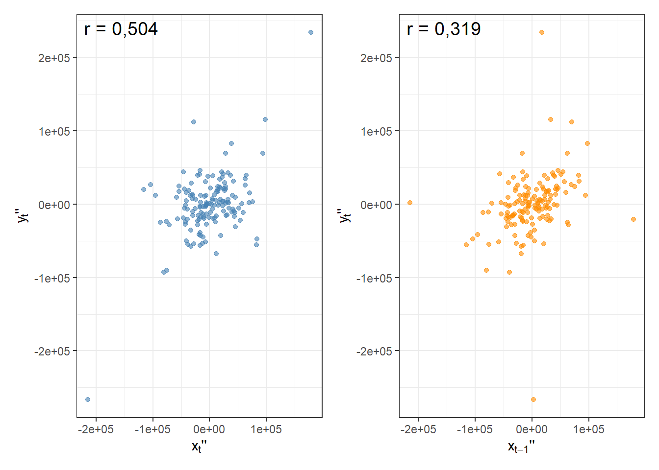 \[ r_{xy,k} = \frac{\sum_{t=k+1}^T (y_t-\bar{y})(x_{t-k}-\bar{x})}{\sqrt {\sum_{t=1}^T (y_t-\bar{y})^2} \sqrt {\sum_{t=1}^T (x_{t-k}-\bar{x})^2}} \tag{7.4}\]